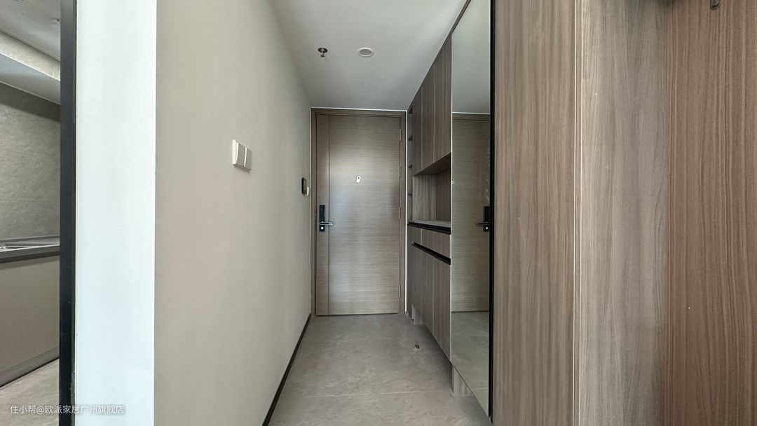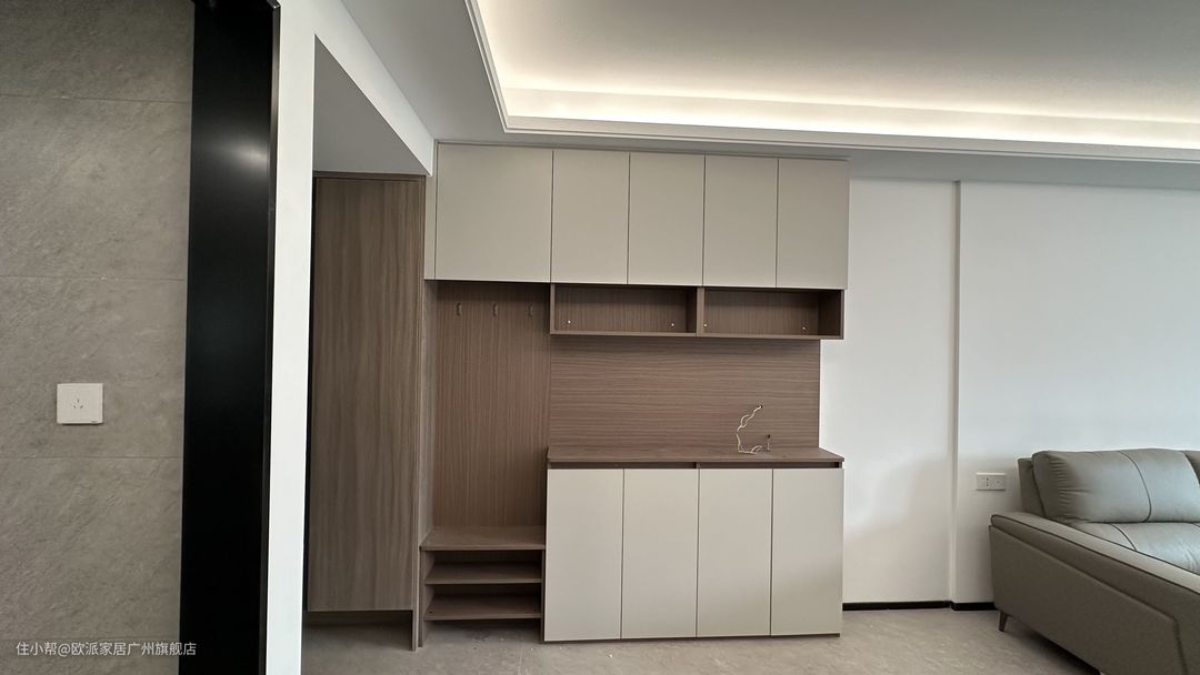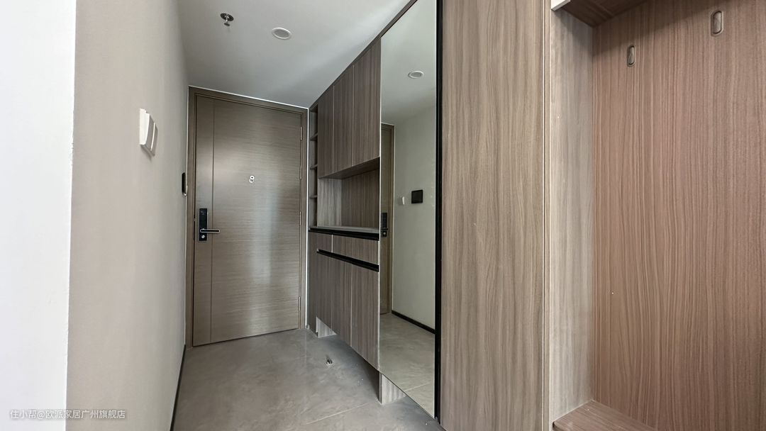 ① 进门靠墙定制入户柜,进深轻薄的同时也能满足收纳需求。中间设置镂空区,方便随手方式包包、钥匙,也可以提前预留插座,方便小电器的使用,回家也不用摸黑 ② 柜子下面预留15cm换鞋区,换穿更方便,隐藏鞋子门口不会乱糟糟。柜内设置活动格,满足不同鞋类的收纳归类 ③ 定制一面镜面柜,方便出门整理着装,实用性拉满