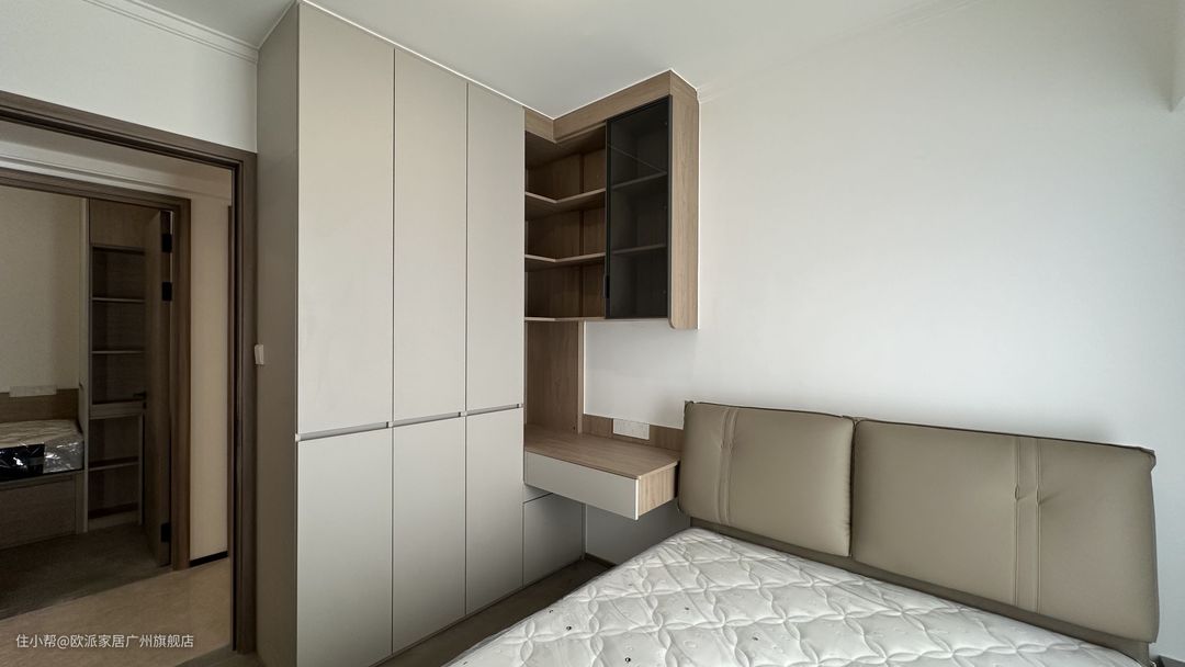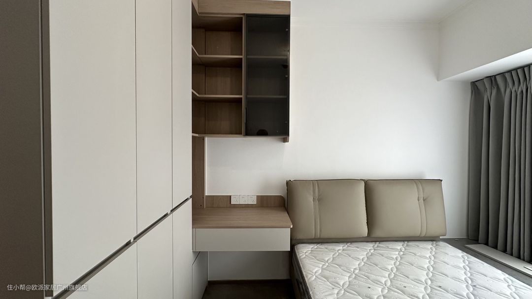 ① 主卧靠墙定制顶天衣柜,分为二段式,交接处内嵌式拉手设计,整体简约但有设计感 ② 衣柜靠墙拐角延伸台面和吊柜,秒变化妆台&办公区,收纳书籍或化妆品,充分利用垂直空间