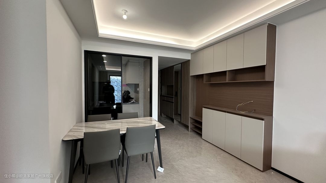 ① 餐厅设置在客厅旁,中间不做隔断,增强互动性和光线的通透性 ② 靠入户柜一侧定制顶天餐边柜,中间设置镂空区,提前预留插座,方便摆放盆栽等&小家电的使用,开放格收纳&展示美酒、器具等,封闭柜收纳不常用的物品,不易落灰 ③ 整个柜子以月牙白+原木色做搭配,搭配免拉手设计,整体简约有质感,实用性也拉满