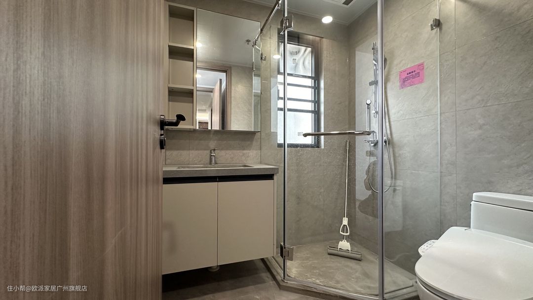 ① 卫生间干湿分离设计,选用钻石型玻璃门隔断,双向开门设计,防止老人小孩沐浴时出意外门打不开的问题 ② 定制镜面壁龛和洗手台柜,满足卫生间收纳需求,免拉手设计拿取也十分方便,同时也能保证空间的活动性
