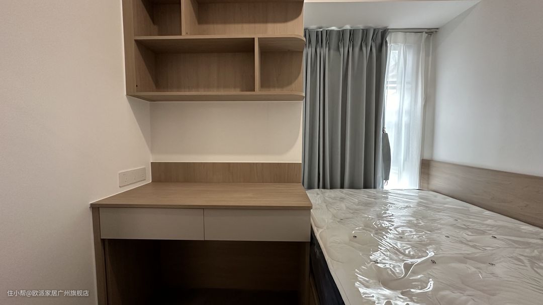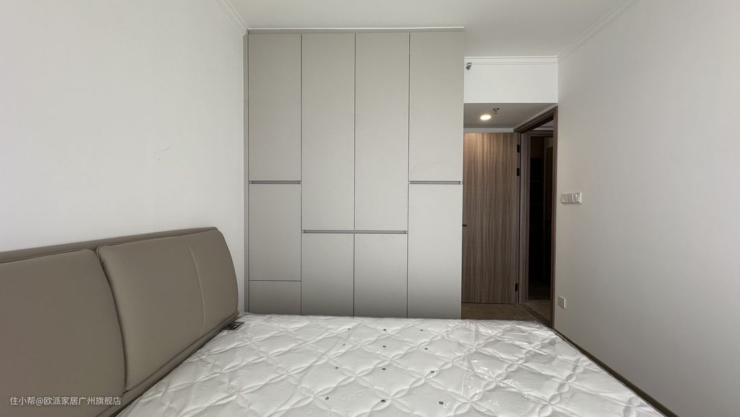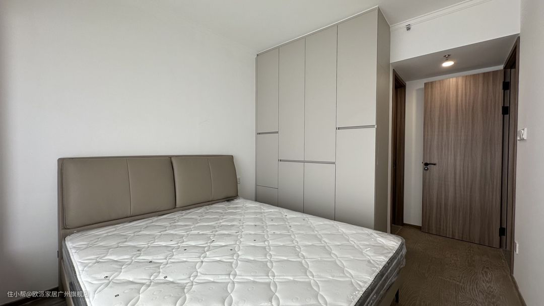 ① 次卧作为父母或亲朋好友休息的地方,同样满足了生活需求,1.8m的床+软靠背更加舒适 ② 靠墙定制顶天衣柜,根据不同衣物类型定制柜内、柜门高度宽度,简约但有设计感