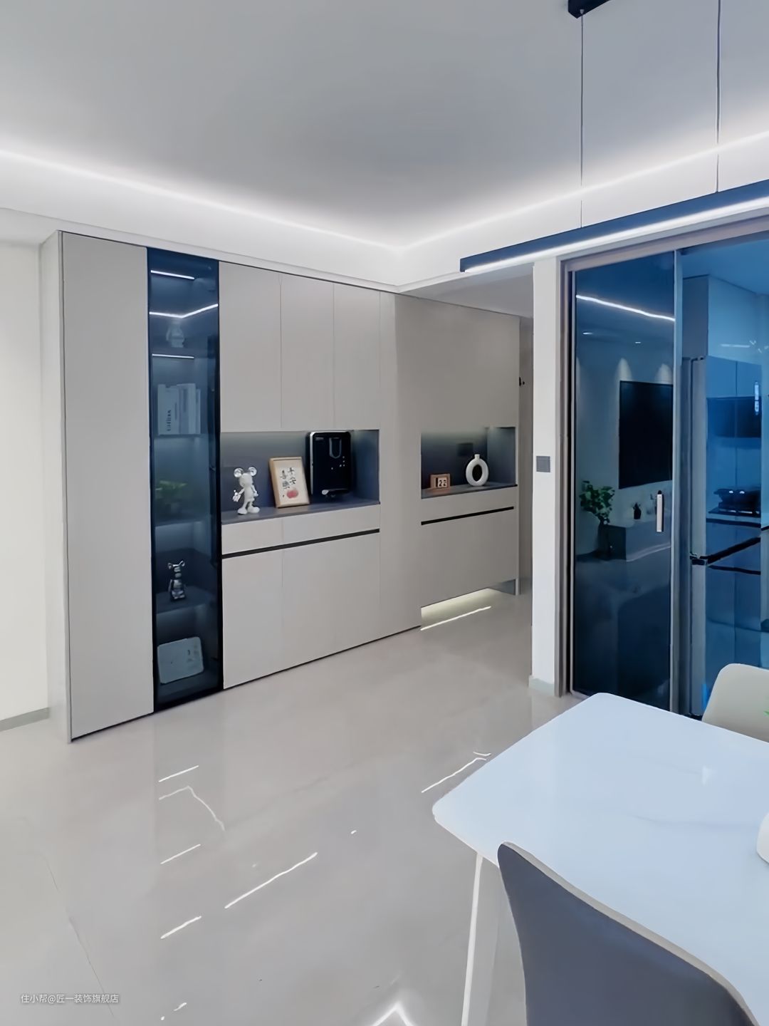 入户设置鞋柜和餐边柜一体设计。鞋柜底部留空放置拖鞋,方便日常生活。餐边柜增加黑色金属玻璃柜展示空间,用于展示餐厅中的餐具或艺术品。柜子中间留空安装指引机,方便客人了解餐厅布局。柜门采用无拉手设计,更加简约。顶面做双眼皮吊顶,增加空间层次感。