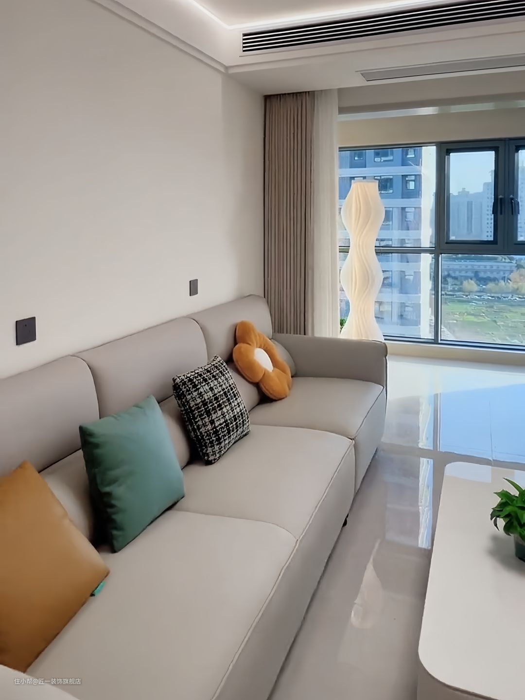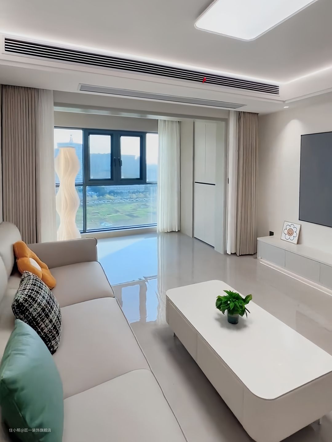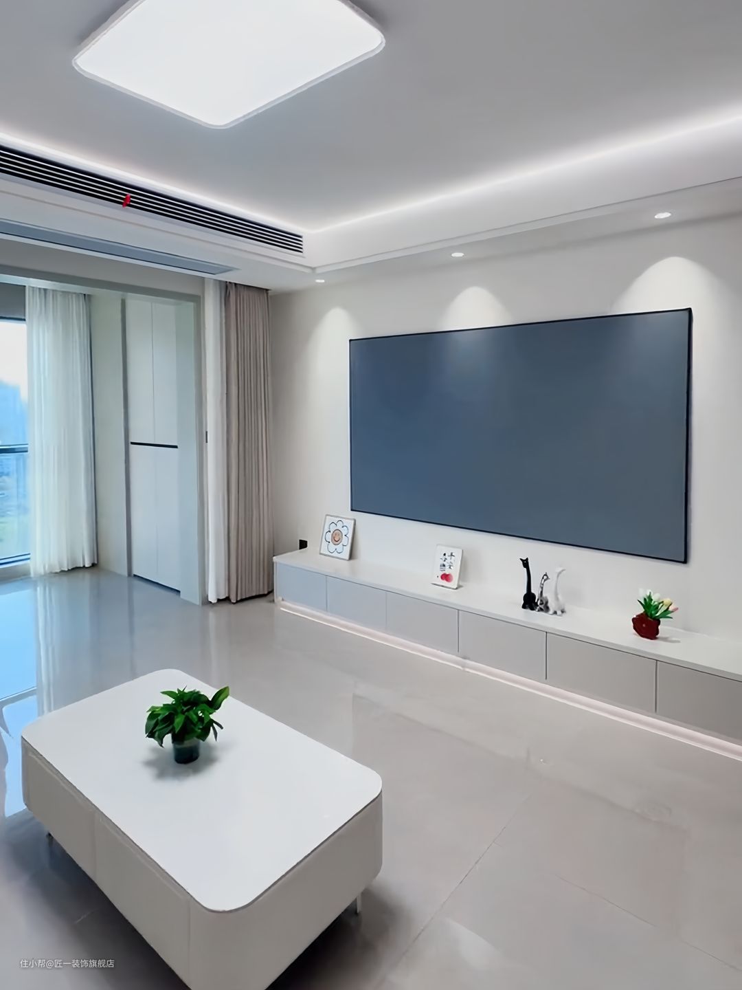 客厅采用浅灰色通体大理石瓷砖,一直通铺到阳台。阳台去除推拉门,增加空间通透性。奶茶色皮质沙发和奶咖色窗帘的搭配,营造出温馨舒适的氛围。电视背景墙安装投影幕布,搭配上灰色的悬空电视柜,底部留灯带,增加高级感