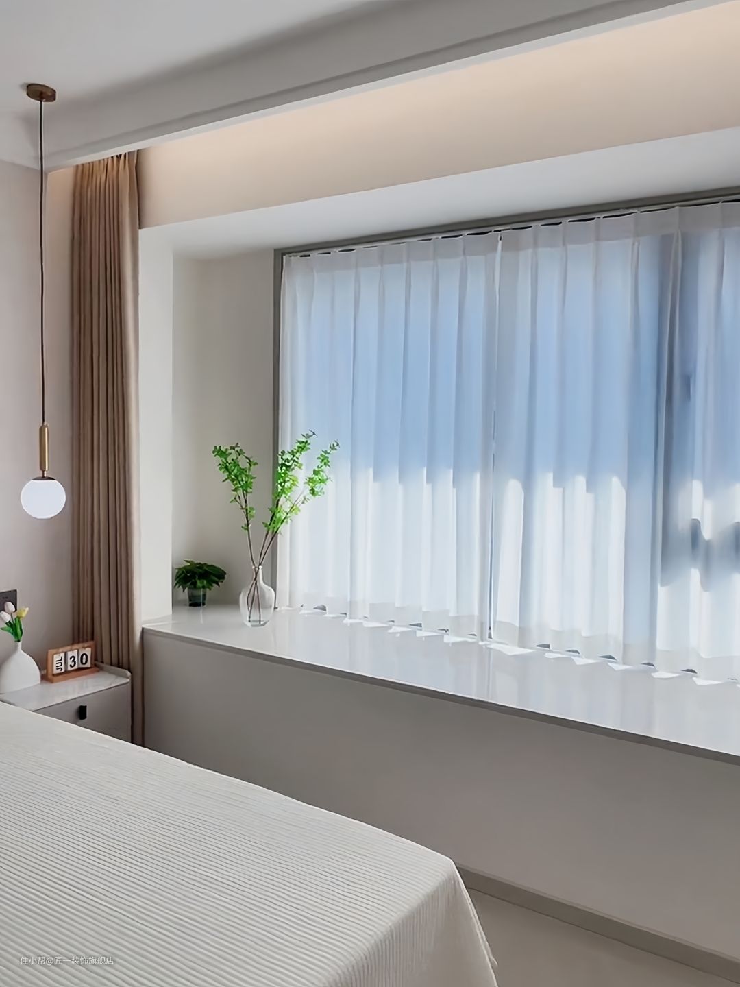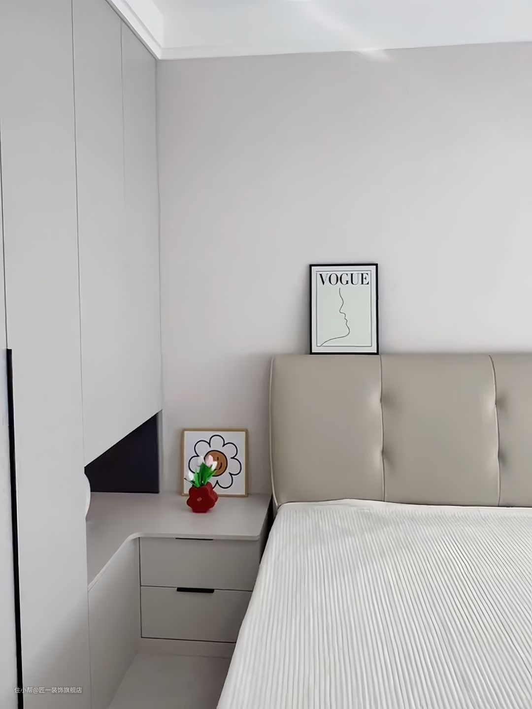 主卧室墙面刷奶咖色乳胶漆,搭配上奶咖色皮质床。卧室的飘窗打不掉,铺上石材,提前预留窗帘盒安装窗帘。卧室衣柜选择灰色衣柜转角床头柜一体设计,柜子做到顶更加简约实用。