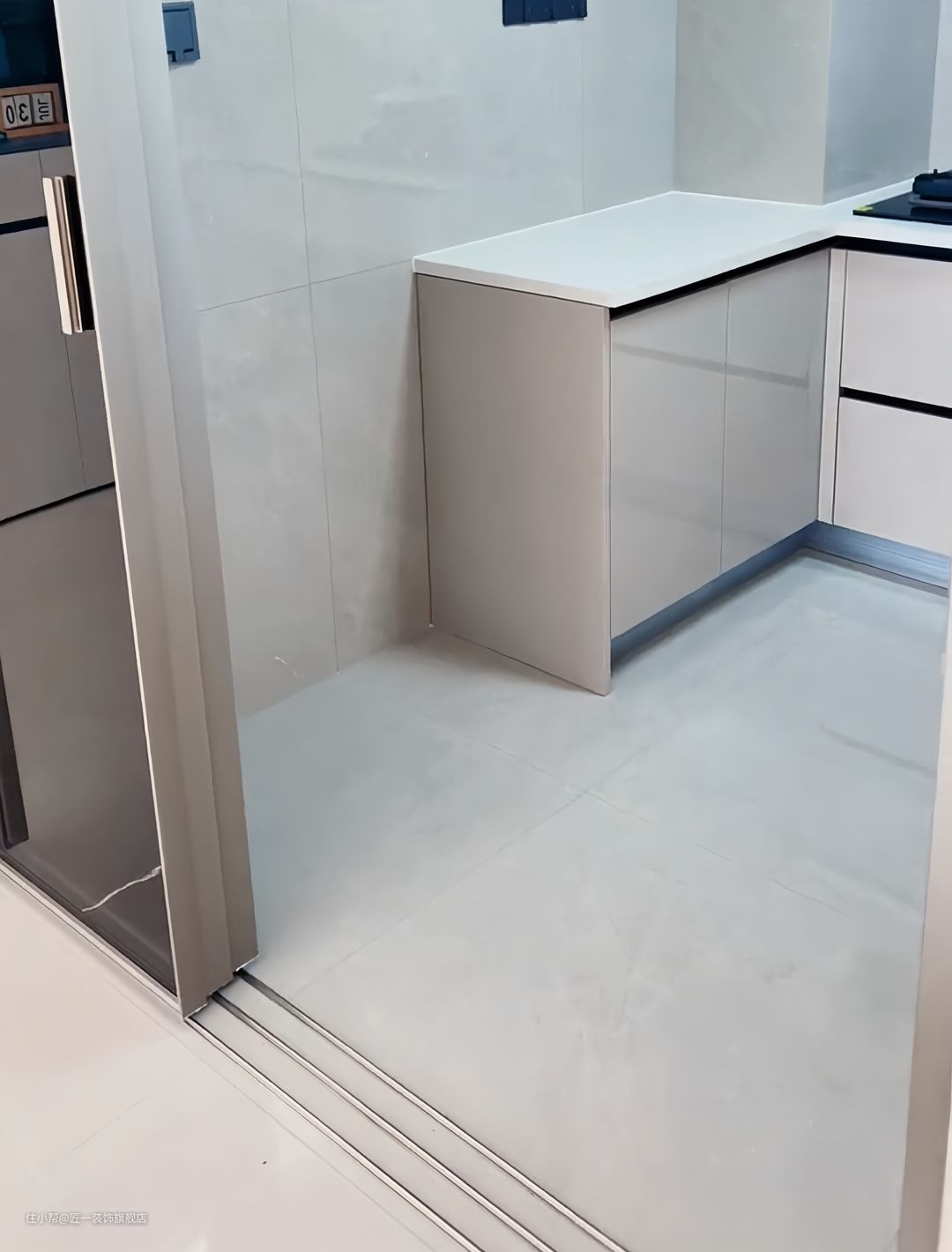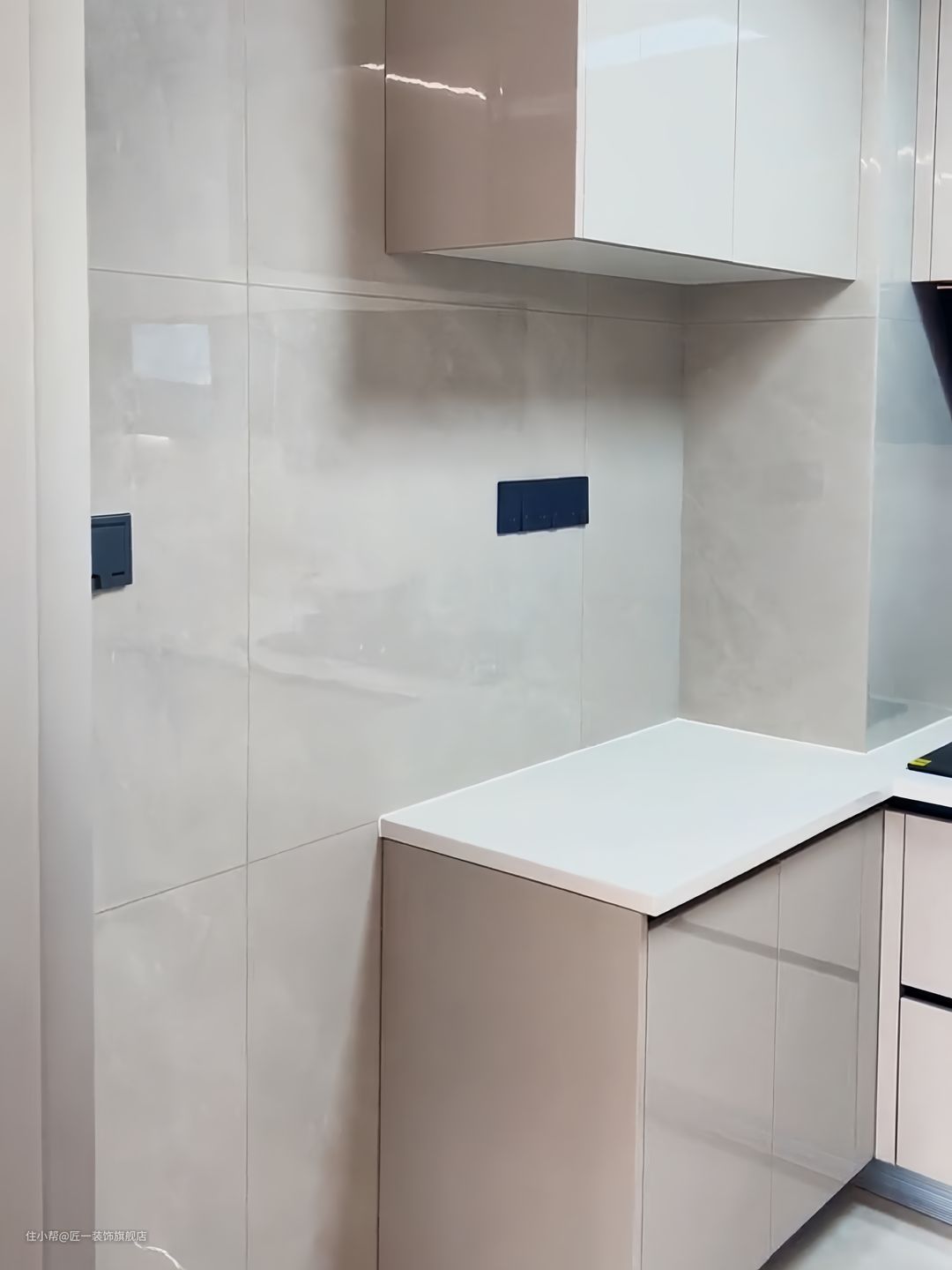 厨房做三联动极窄边框的推拉门,方便食材的进出。厨房内做U型橱柜,奶茶色吊柜和地柜台面选择白色纯色石英石水槽靠近窗户部分,提供充足的光线和良好的视野。