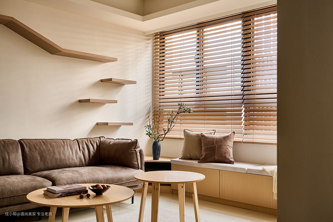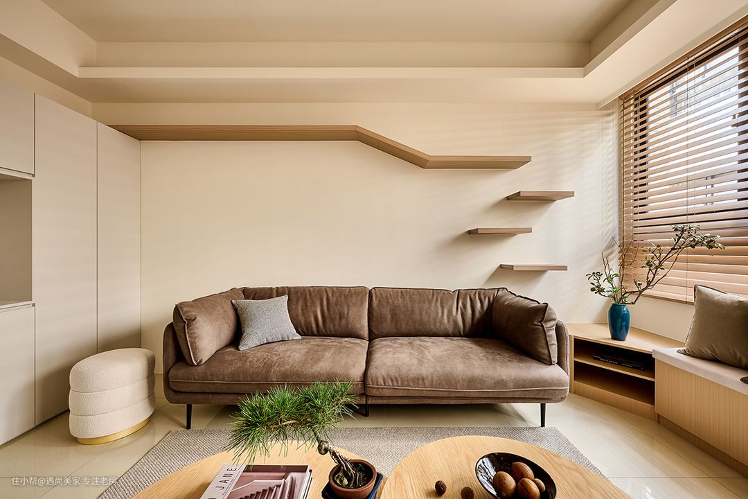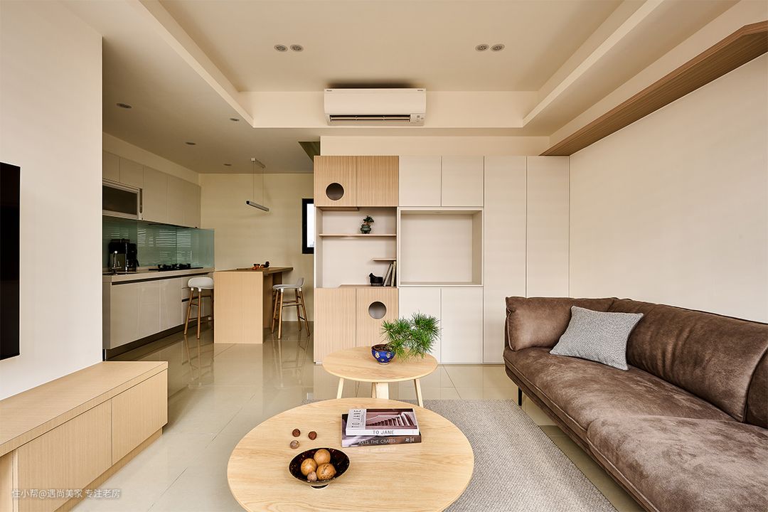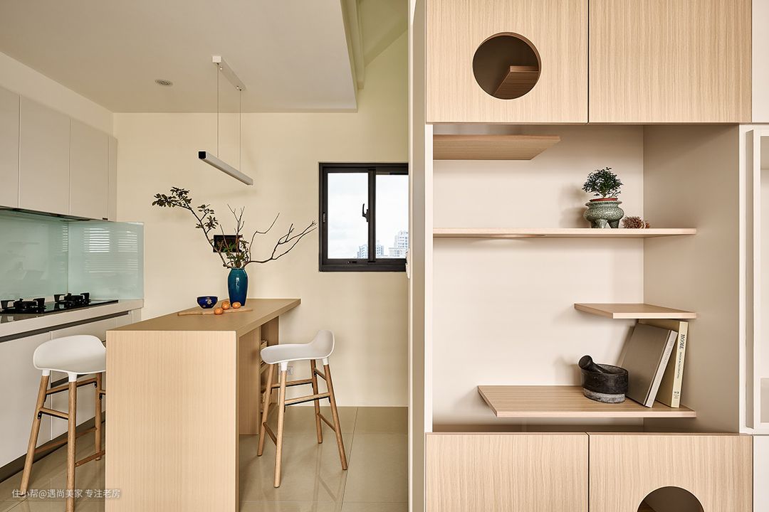 自然光与纯白墙面的巧妙结合,凸显出木质的淡雅气息,为室内空间增添了一抹温暖而宁静的色调,营造出朴实幸福的家居氛围。 电视机柜与窗边卧榻的连贯设计,不仅拓展了收纳空间,还丰富了客厅的使用场景,让空间更具功能性和灵活性。无论是周末的亲友聚会还是平日的休闲休息,都能得到充分的满足。 斜面收边柜体的设计巧妙地将沙发与卧榻连接起来,既考虑了风水因素,为屋主提供了摆放招财摆件的空间,又作为猫跳台的最后一阶,实现了空间的多重利用。 在有限的40㎡空间内,设计师巧妙地利用梁位走向和天花高低作为隐性界线,成功界定了客厅与餐厨区域,既满足了屋主好客又爱下厨的生活方式,又保持了空间的开放感和通透性。