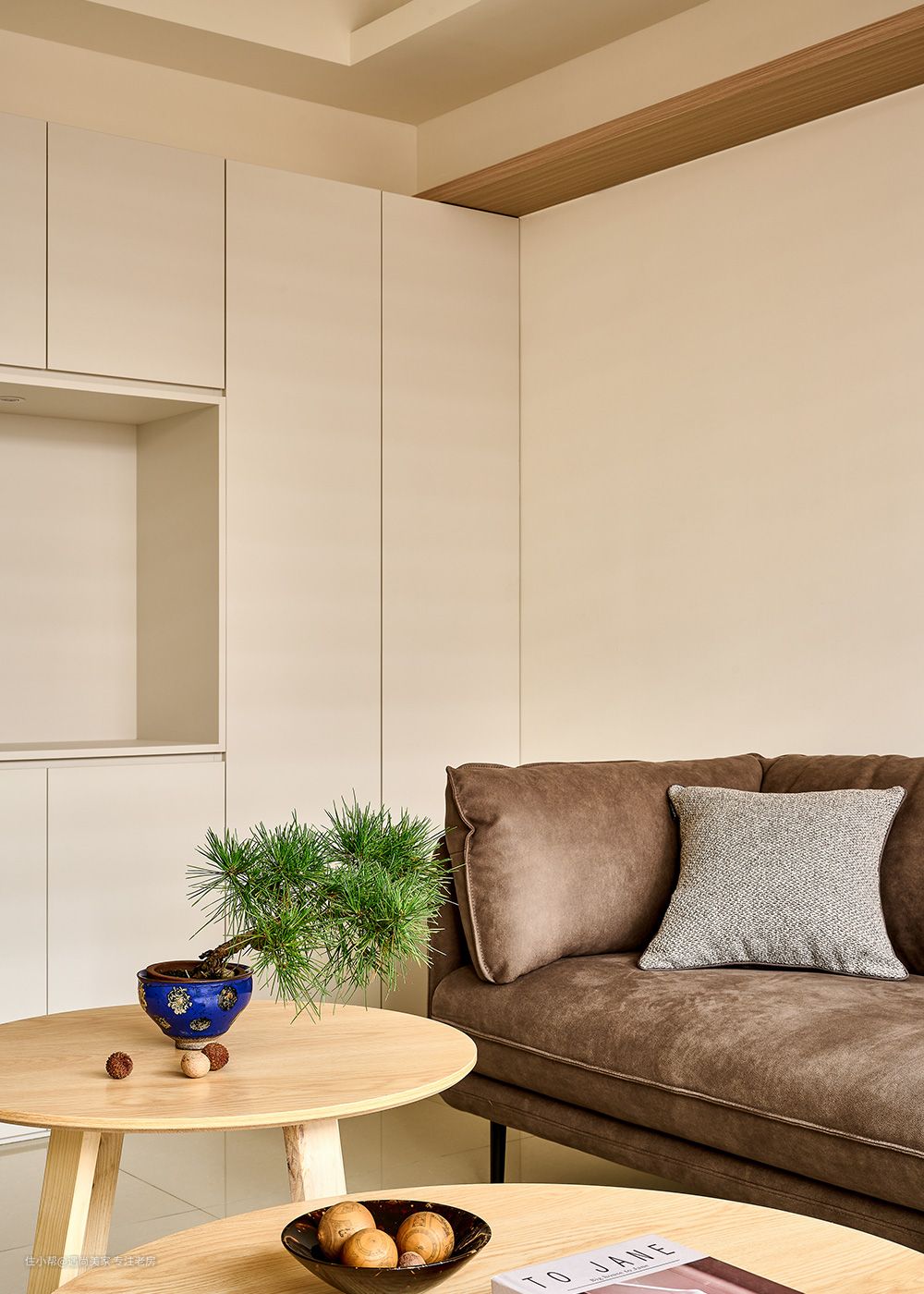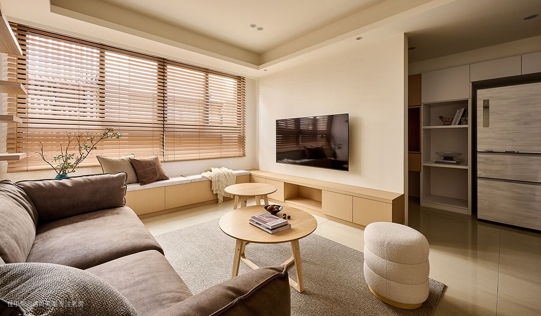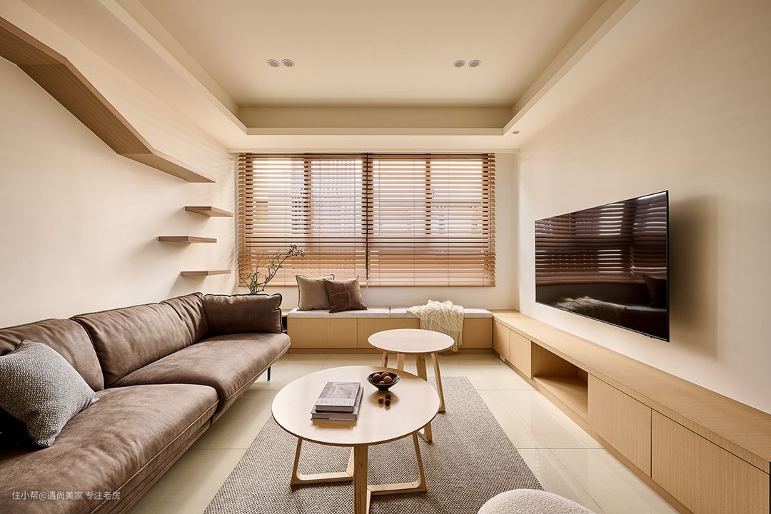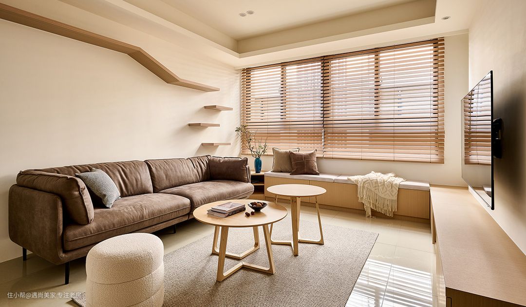 自然光与纯白墙面的巧妙结合,凸显出木质的淡雅气息,为室内空间增添了一抹温暖而宁静的色调,营造出朴实幸福的家居氛围。 电视机柜与窗边卧榻的连贯设计,不仅拓展了收纳空间,还丰富了客厅的使用场景,让空间更具功能性和灵活性。无论是周末的亲友聚会还是平日的休闲休息,都能得到充分的满足。 斜面收边柜体的设计巧妙地将沙发与卧榻连接起来,既考虑了风水因素,为屋主提供了摆放招财摆件的空间,又作为猫跳台的最后一阶,实现了空间的多重利用。 在有限的40㎡空间内,设计师巧妙地利用梁位走向和天花高低作为隐性界线,成功界定了客厅与餐厨区域,既满足了屋主好客又爱下厨的生活方式,又保持了空间的开放感和通透性。