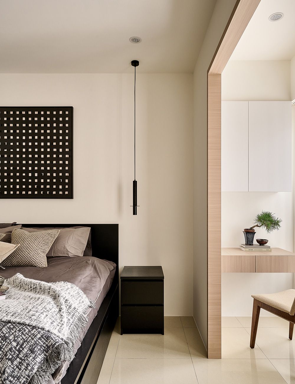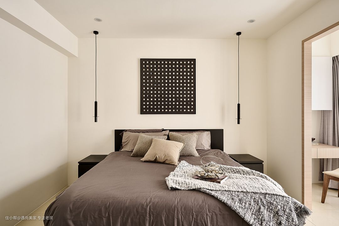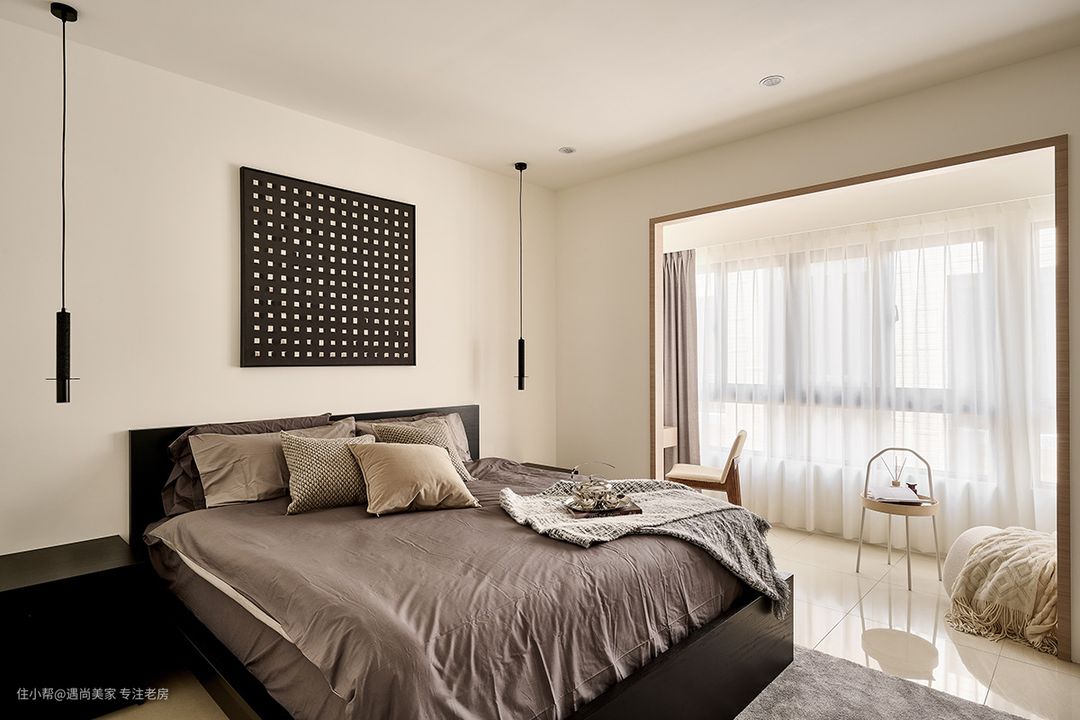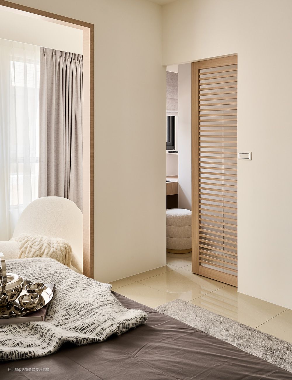 床头墙简洁设计:为了满足屋主对于床头墙不做任何造型的诉求,设计师巧妙地运用了深黑色家具,通过跳色手法成功捕捉视觉焦点,为空间带来稳定感,有助于心绪的沉淀,从而营造出宁静舒适的睡眠环境。 半开放书房规划:考虑到屋主希望在卧室内增加工作空间,同时避免打扰到伴侣休息,设计师精心规划了一个半开放书房。通过砌起一道隔间,既保留了采光,又成功区划出工作区域,实现了工作与休息的和谐共存。 隔墙两侧功能布局:书桌与阅读卧榻分别藏于隔墙两侧,不仅提升了空间的隐私感,还充分利用了采光窗的篇幅,为生活留下了更多余裕。设计师还在门洞四周贴附了ㄇ字木皮框,既增强了场域的立体感,又起到了框景作用,使这片日光更加聚焦,营造出澄明通透的氛围。 大容量更衣室规划:根据屋主的需求,设计师在卫浴与书房之间规划了一个大容量的更衣室。通过编排置顶高柜和在转角处设置开放柜,女主人的衣物和包包都能各得其所,满足了收纳需求。 百叶门缓解压迫感:为了避免柜体造成的压迫感,更衣室采用了百叶门作为门板,打破了封闭式的独立格局,增强了空间的通透感。这不仅使内部的自然光和空气得以流通,还淡化了房内层层隔间的局促感,为整个空间增添了景深层次。