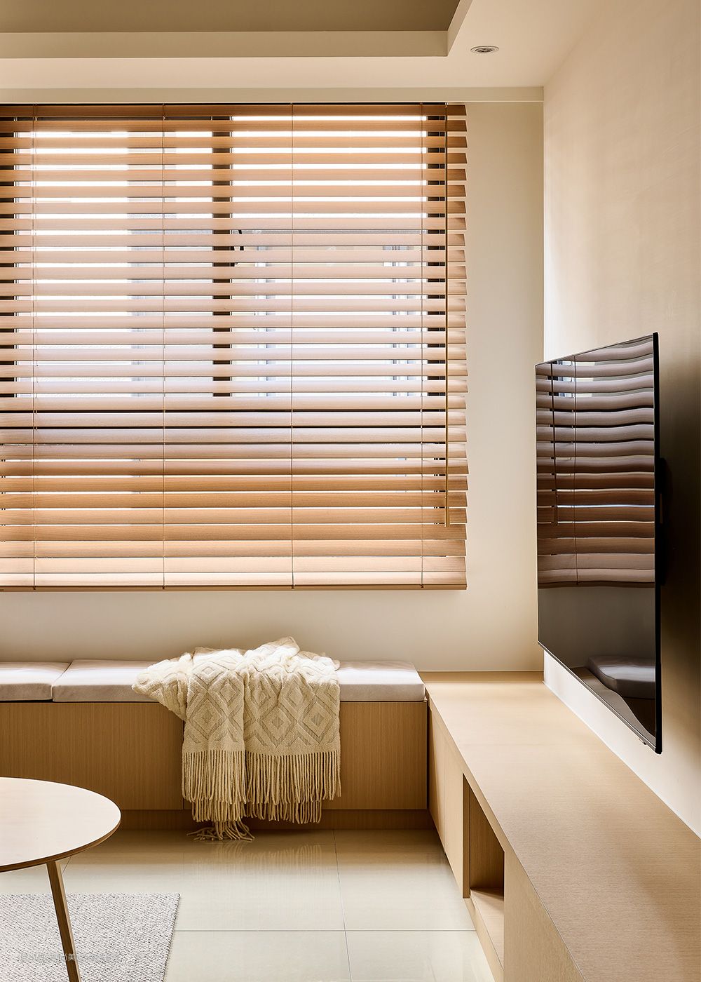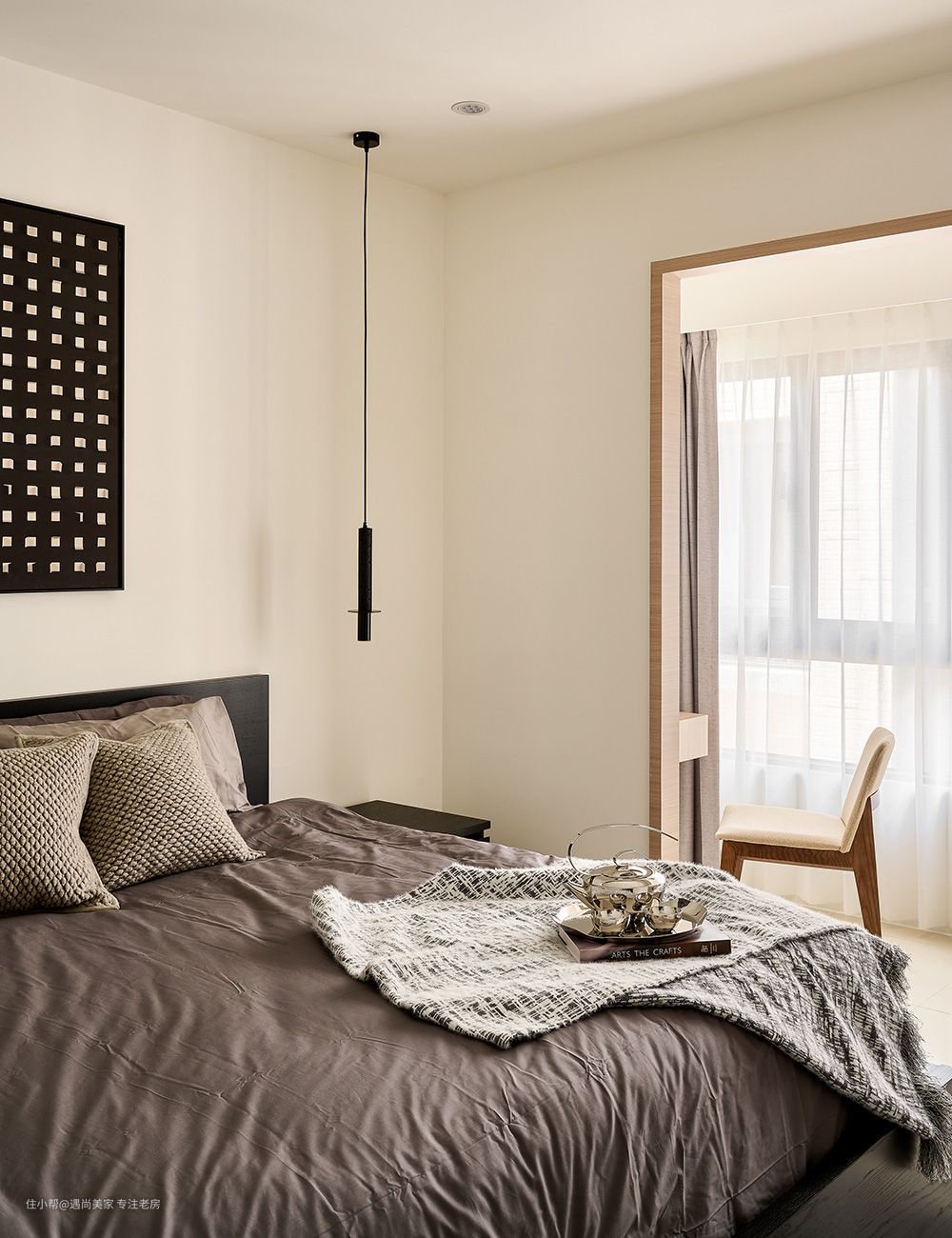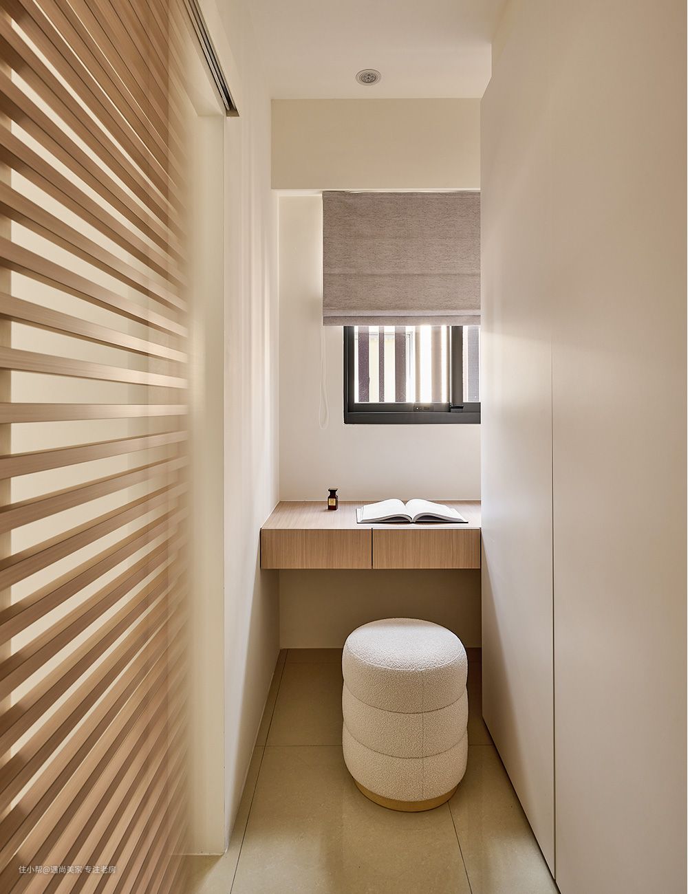 床头墙简洁设计:为了满足屋主对于床头墙不做任何造型的诉求,设计师巧妙地运用了深黑色家具,通过跳色手法成功捕捉视觉焦点,为空间带来稳定感,有助于心绪的沉淀,从而营造出宁静舒适的睡眠环境。 半开放书房规划:考虑到屋主希望在卧室内增加工作空间,同时避免打扰到伴侣休息,设计师精心规划了一个半开放书房。通过砌起一道隔间,既保留了采光,又成功区划出工作区域,实现了工作与休息的和谐共存。 隔墙两侧功能布局:书桌与阅读卧榻分别藏于隔墙两侧,不仅提升了空间的隐私感,还充分利用了采光窗的篇幅,为生活留下了更多余裕。设计师还在门洞四周贴附了ㄇ字木皮框,既增强了场域的立体感,又起到了框景作用,使这片日光更加聚焦,营造出澄明通透的氛围。 大容量更衣室规划:根据屋主的需求,设计师在卫浴与书房之间规划了一个大容量的更衣室。通过编排置顶高柜和在转角处设置开放柜,女主人的衣物和包包都能各得其所,满足了收纳需求。 百叶门缓解压迫感:为了避免柜体造成的压迫感,更衣室采用了百叶门作为门板,打破了封闭式的独立格局,增强了空间的通透感。这不仅使内部的自然光和空气得以流通,还淡化了房内层层隔间的局促感,为整个空间增添了景深层次。
