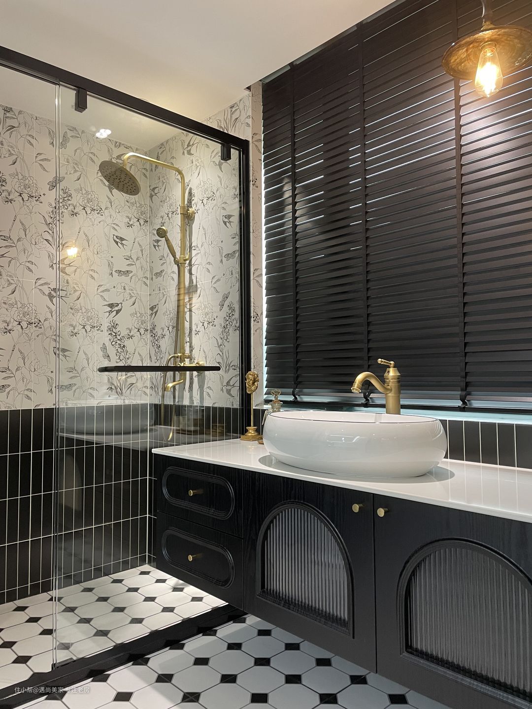 黑白与金色的经典搭配:浴室的设计采用了黑白相间的瓷砖,这是现代家居中常见的经典配色方案,不仅显得时尚,还能带来清晰、整洁的视觉体验。金色装饰元素的加入,如金色的水龙头和淋浴头,则为整个空间增添了一丝奢华感,提升了整体的质感。