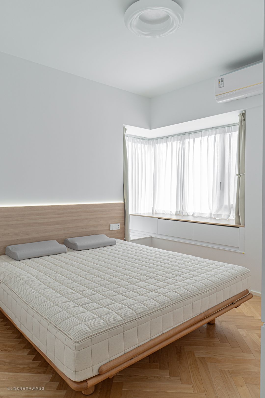 床贴着窗户而布置,床头业主选择柔软的羊绒软包,犹如云朵般的形状,给卧室增添了几分温柔。