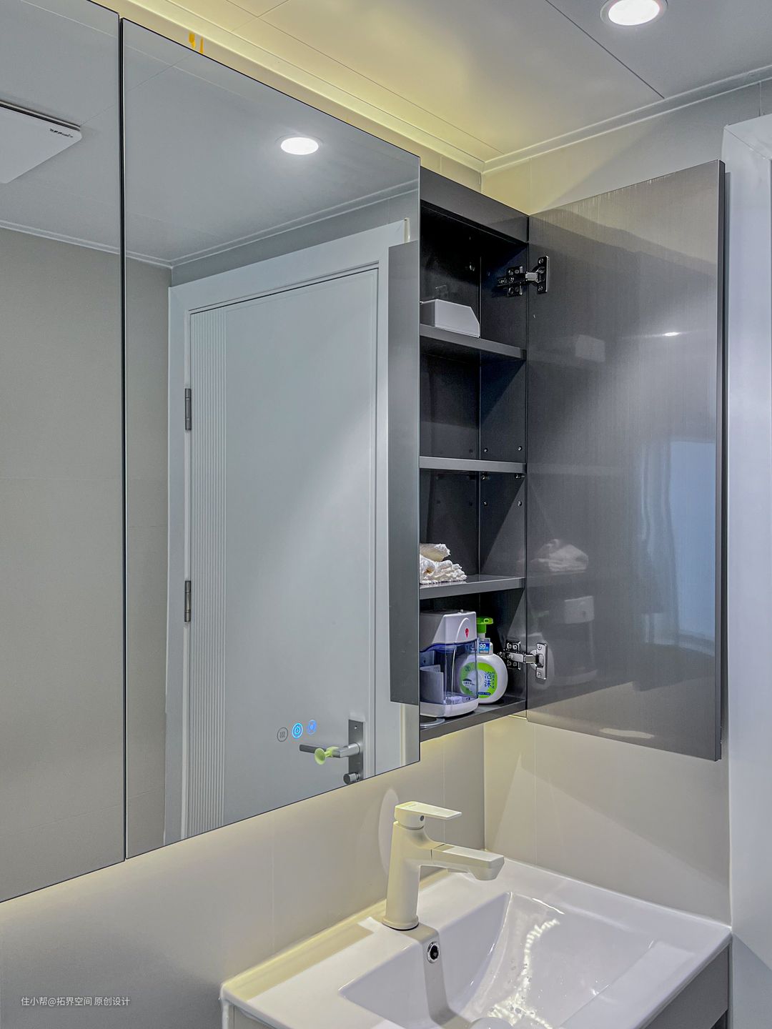 悬浮洗漱台靠近马桶的侧边添加开放格,方便置物,一整面的镜柜设计,不仅在视觉上产生了扩大的效果,还在无形中提高了储物功能。