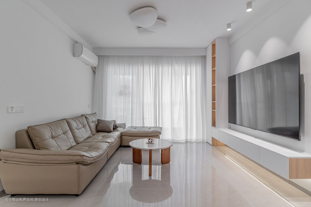 客厅在基础风格上融入了奶咖色,使得冷硬的地面都都变得温柔了,一眼望去是温馨而又极具质感的空间。