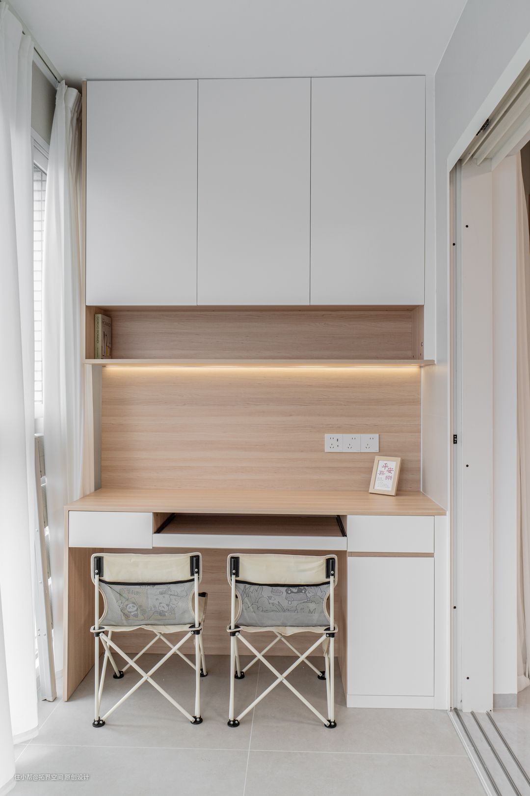 床尾留足开门的空间后,便定制“顶天立地”的衣柜,纯白色柜体几乎与墙面融为一体,加上无拉手设计,减少整柜带来的压迫感,而木色线条则让柜体不那么单调,更显精致感。