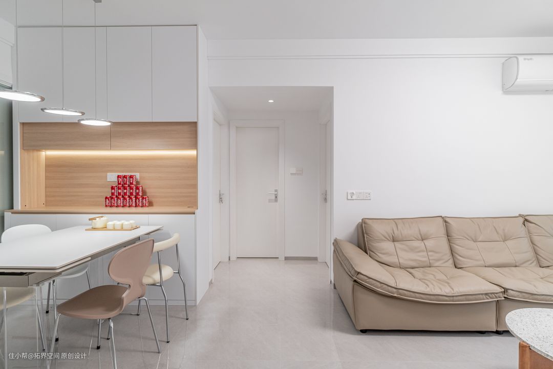 透过玄关走廊进入客餐厅,你会感受到一阵清新的气息扑面而来,地面通铺浅灰色亮面地砖,配合奶油白的墙面,整体视觉上亮堂显大。