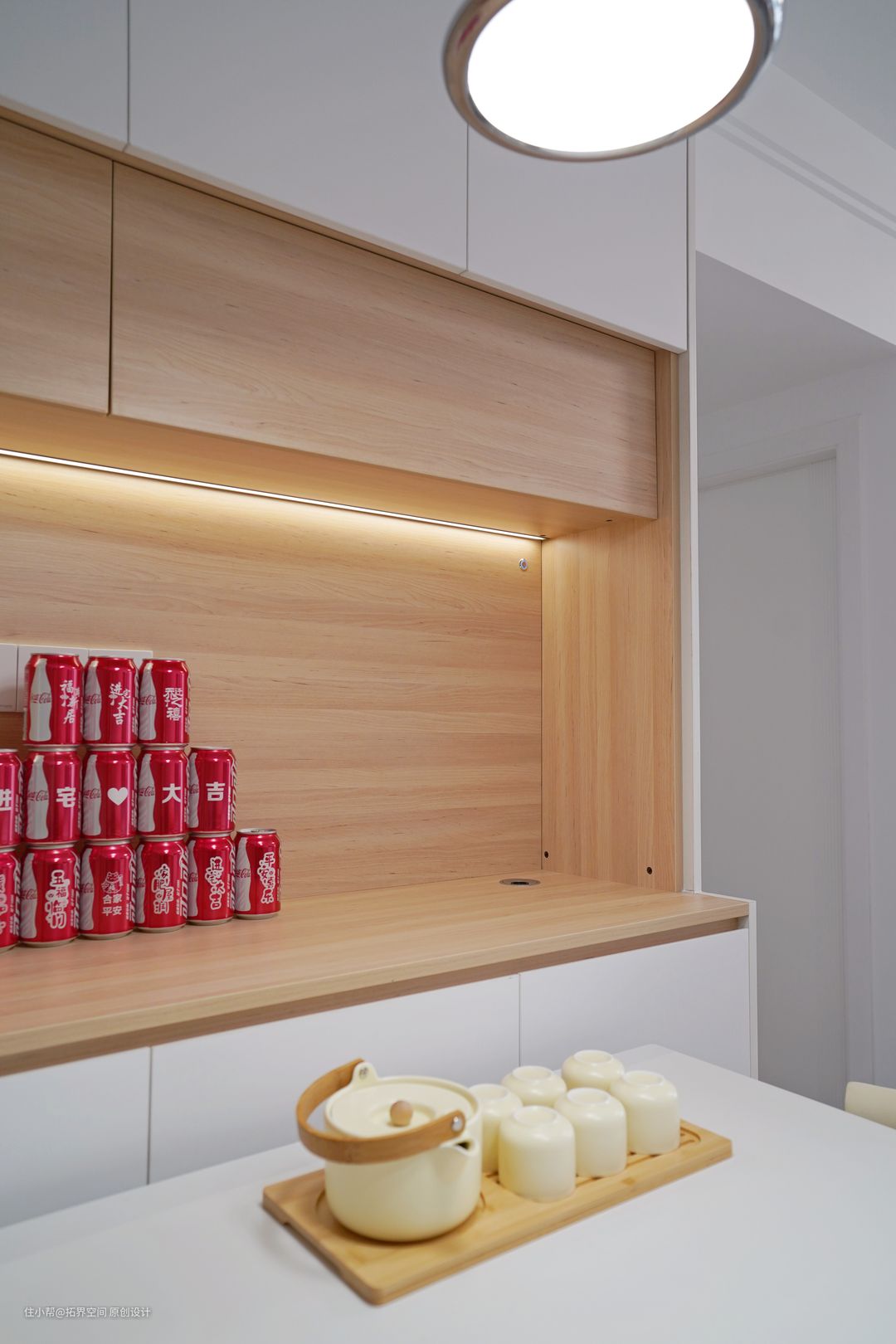 餐边柜主要配色是奶油白和原木纹色,无拉手柜门加灯带设计,视觉上更显清爽自然,轻松打造整体层次感和空间美感。