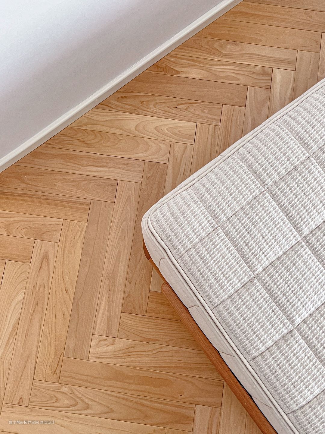 主卧的布局设计给人优雅从容之感,在地面采用人字拼木地板,使空间在雅的基调上再添几分浪漫个性。