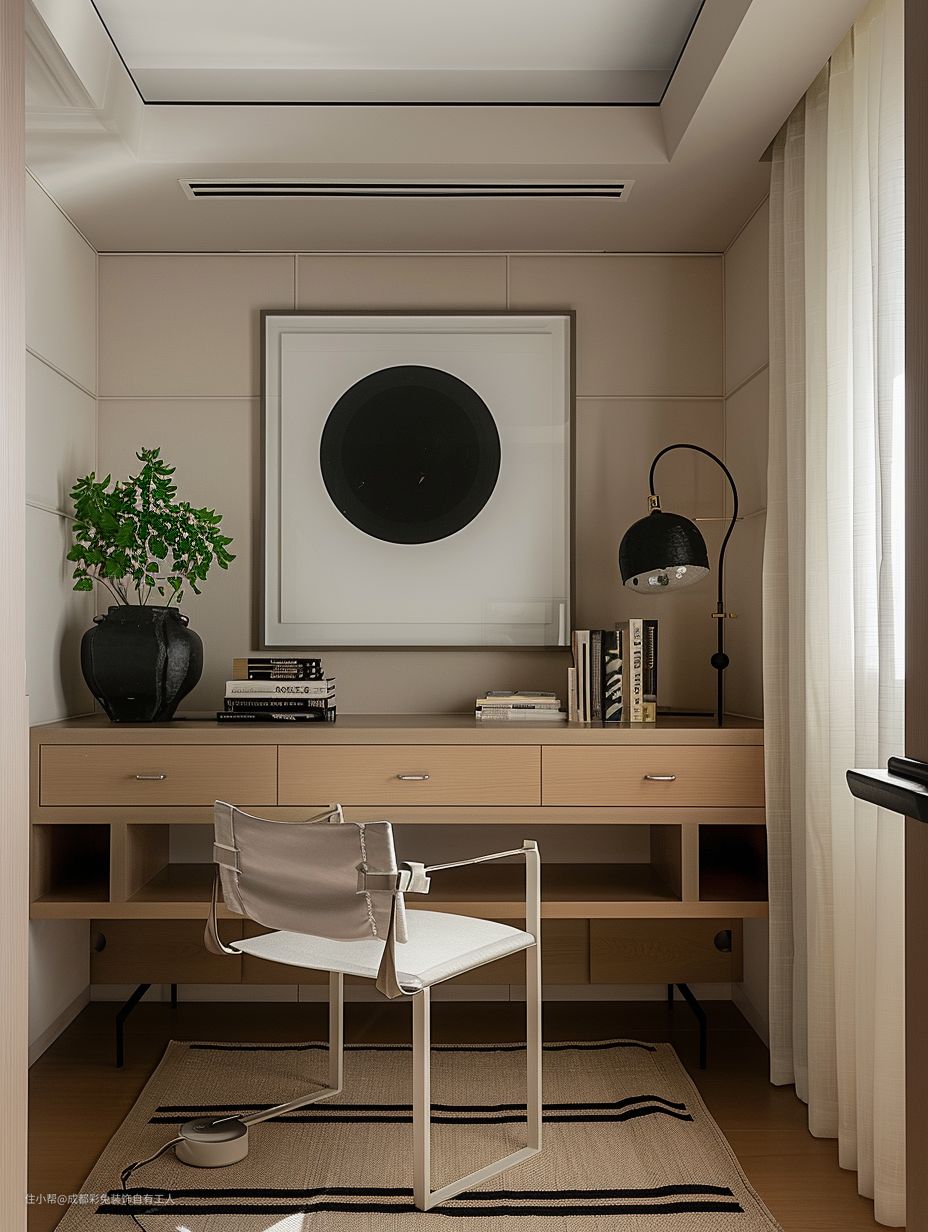 书房的定制书桌柜满足了收纳与工作学习的需求,黑色台灯提供照明。木地板和地毯增加了舒适感,绿植带来生机,挂画装饰增添了艺术氛围。
