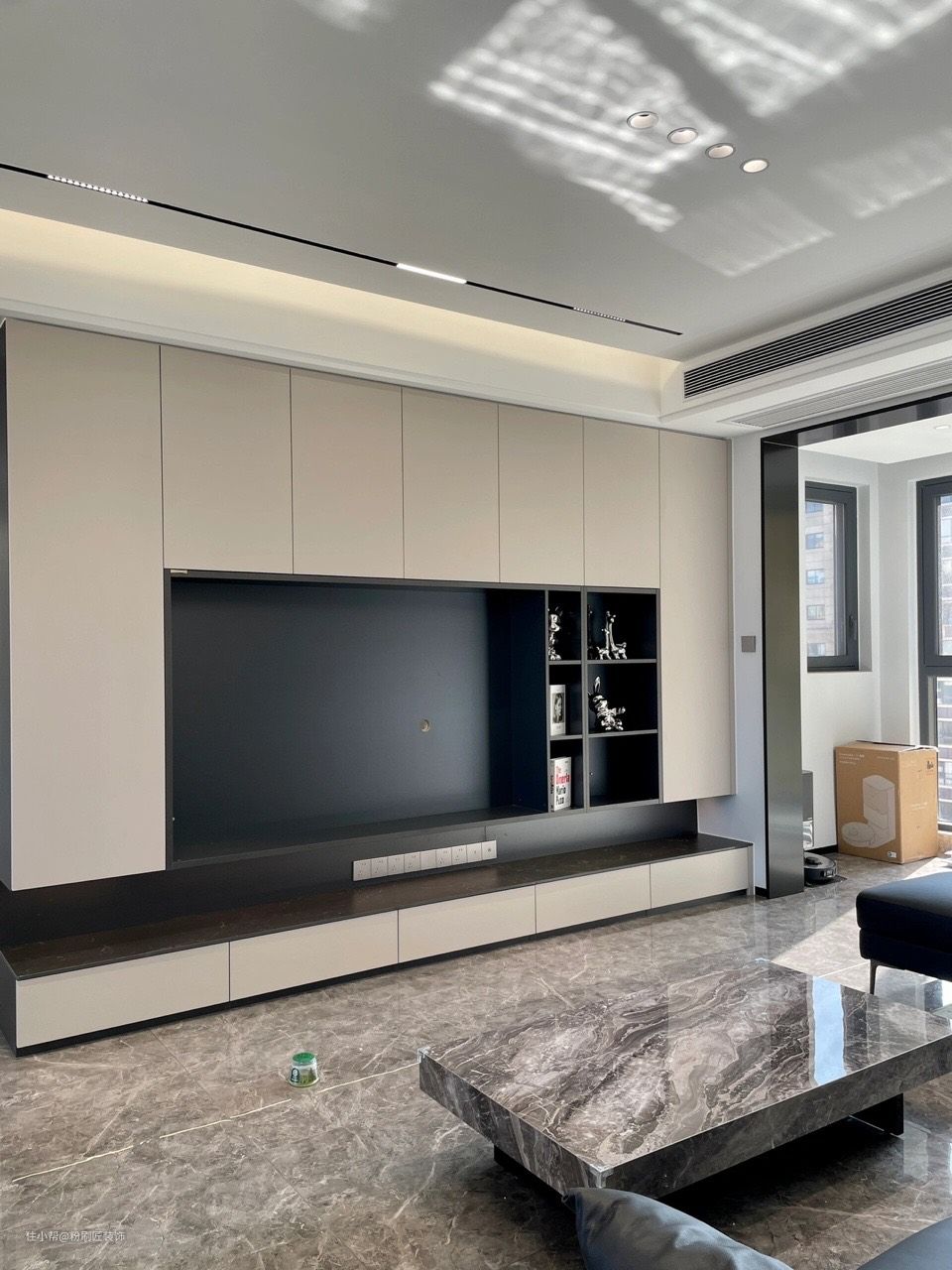 将简约与品味完美融合,为您呈现一个既舒适又高级的居住空间。 在软装搭配上,我们遵循意式极简轻奢的设计理念,追求简约而不失细节。精致的装饰品、艺术品的点缀,让空间焕发出独特的魅力,彰显出主人的品味与格调。 在高级感的基础上 需要多收纳的所以用嵌入式电视机手法,简洁又不凌乱,还可以使家里更加整洁 错落有致的悬浮吊顶与边吊形成对比 内嵌的灯光打造氛围感 黑色皮质沙发提升空间整体质感 更加高级