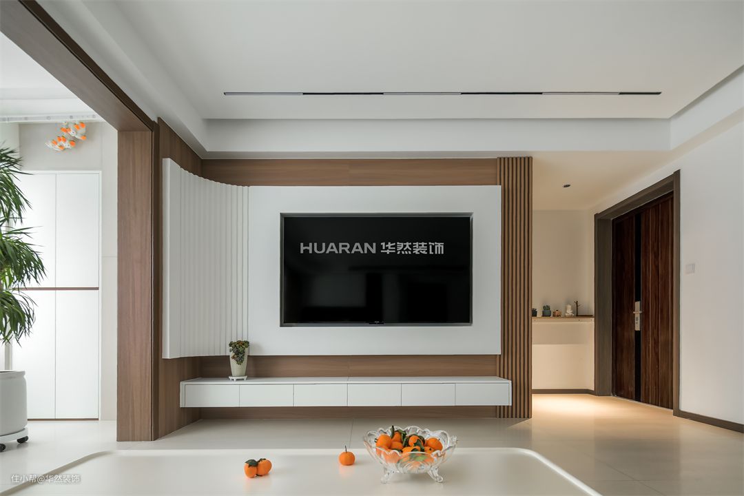 客厅用简洁舒适的语言勾勒出生活的质感 边角弧形双眼皮吊顶+嵌入筒灯 整体显得更加简洁大气有设计感 地面通铺哑光砖 极简柔和 沙发不靠墙 打造象牙白定制柜 加入一列开放格 摆放装饰品、常用小电器 方便实用 电视背景加入木质感进行点缀 悬挑的手法打破了固有秩序 高级轻盈且层次分明 侧边做弧形转角造型,各处空间无缝连接 恰到好处的诉说年轻态空间美学 阳光透过窗户洒进室内 温暖而治愈 豆腐块沙发、岩板茶几与整体配色相呼应 复古小边几、绿植摆放得恰到好处 整个空间和谐又自然
