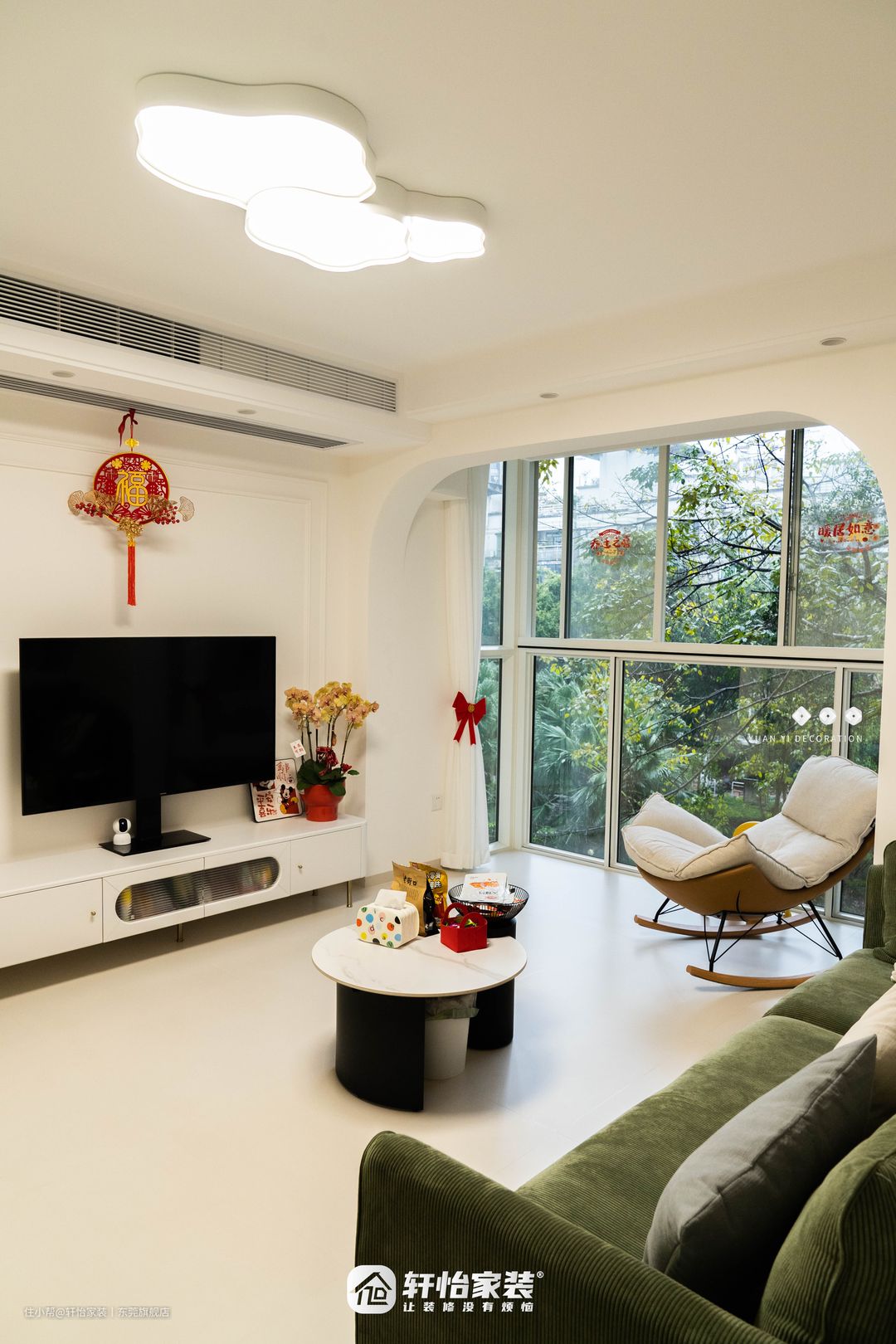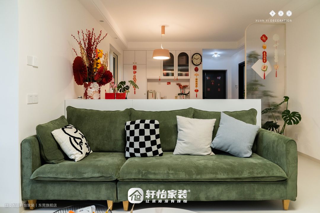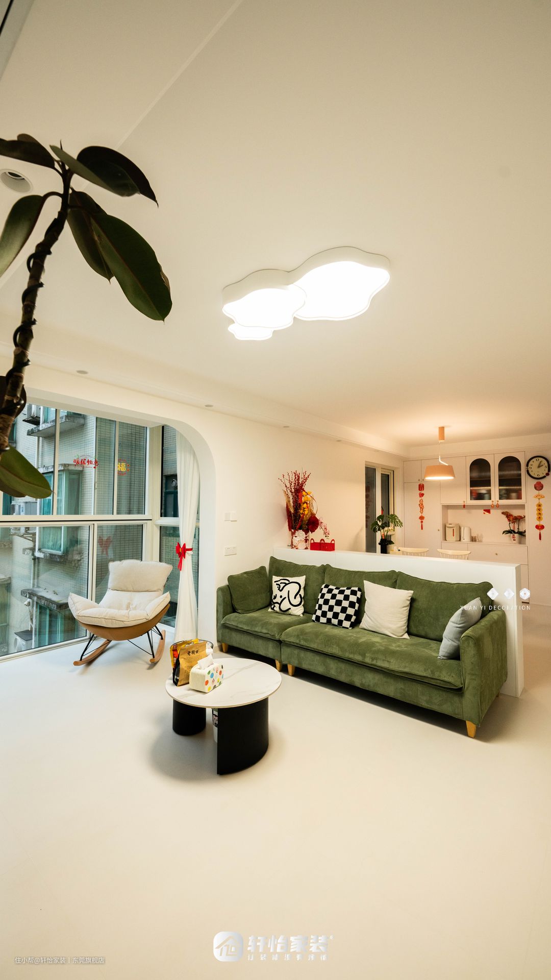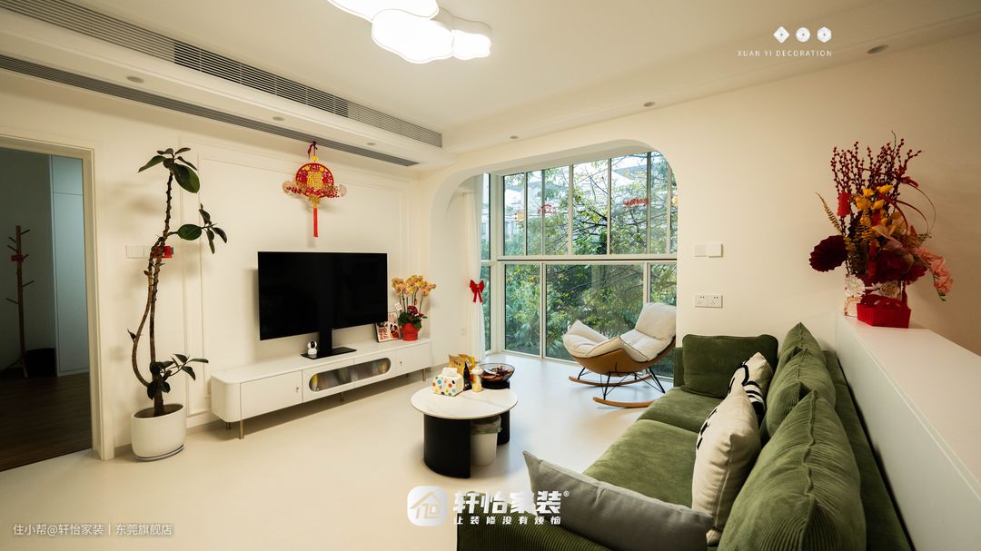 落地窗模糊了内外边界,将满目绿意揽入,应和沙发的绿,生出些许薄荷曼波的气质。地砖通铺,令柔和无垠。 沙发纹理细腻,绒面感将地面柔光衔接,宛若生长。各异的抱枕是居住者的小心思,于一片清新中演绎现代风,却格外有筋骨。 电视墙简单石膏线框排列,摆放轻法式电视柜,黑与白的强烈冲撞,带动视觉空间。巧妙插入的摆件、绿植,是家气质的诠释。
