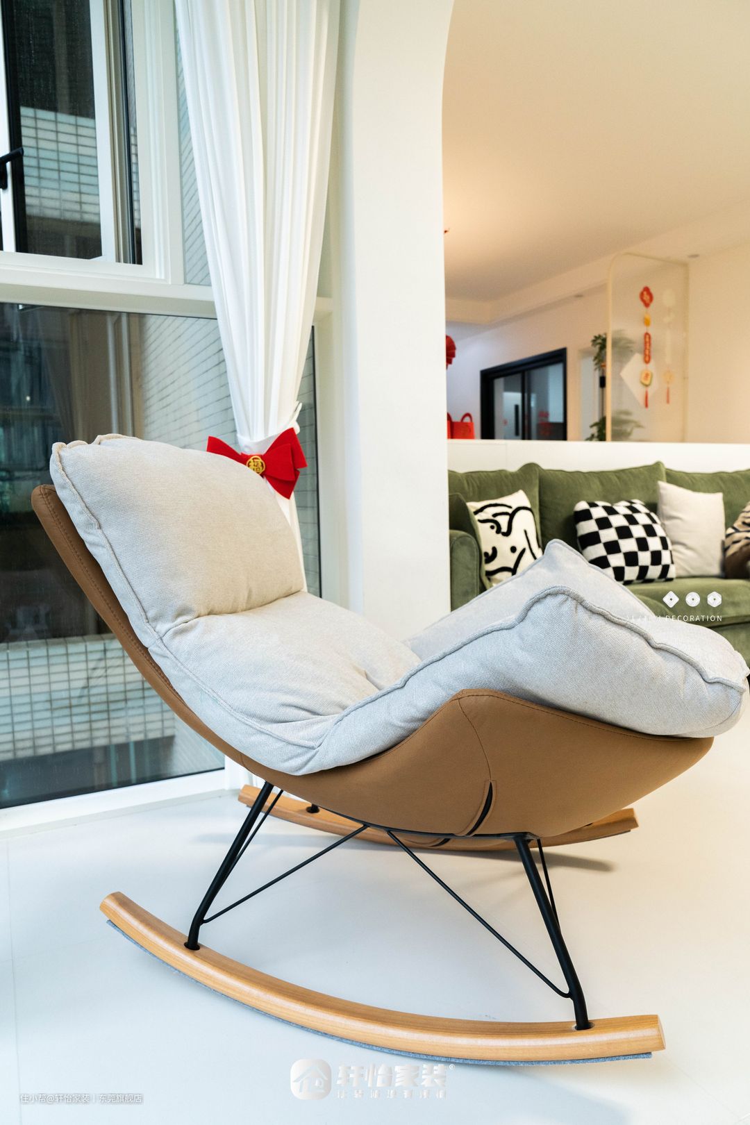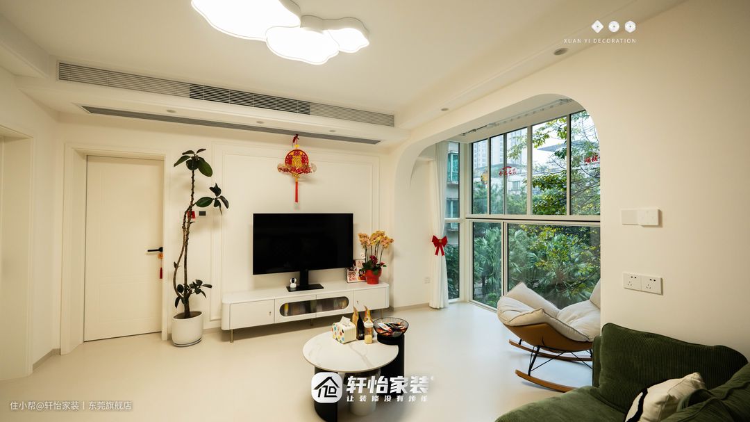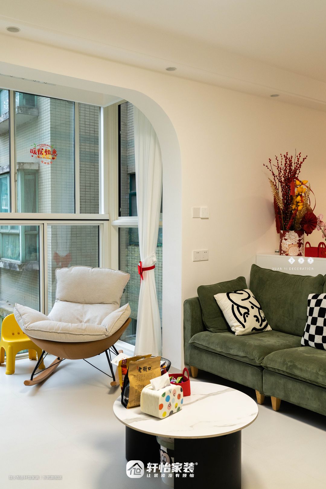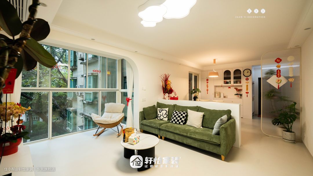 落地窗模糊了内外边界,将满目绿意揽入,应和沙发的绿,生出些许薄荷曼波的气质。地砖通铺,令柔和无垠。 沙发纹理细腻,绒面感将地面柔光衔接,宛若生长。各异的抱枕是居住者的小心思,于一片清新中演绎现代风,却格外有筋骨。 电视墙简单石膏线框排列,摆放轻法式电视柜,黑与白的强烈冲撞,带动视觉空间。巧妙插入的摆件、绿植,是家气质的诠释。