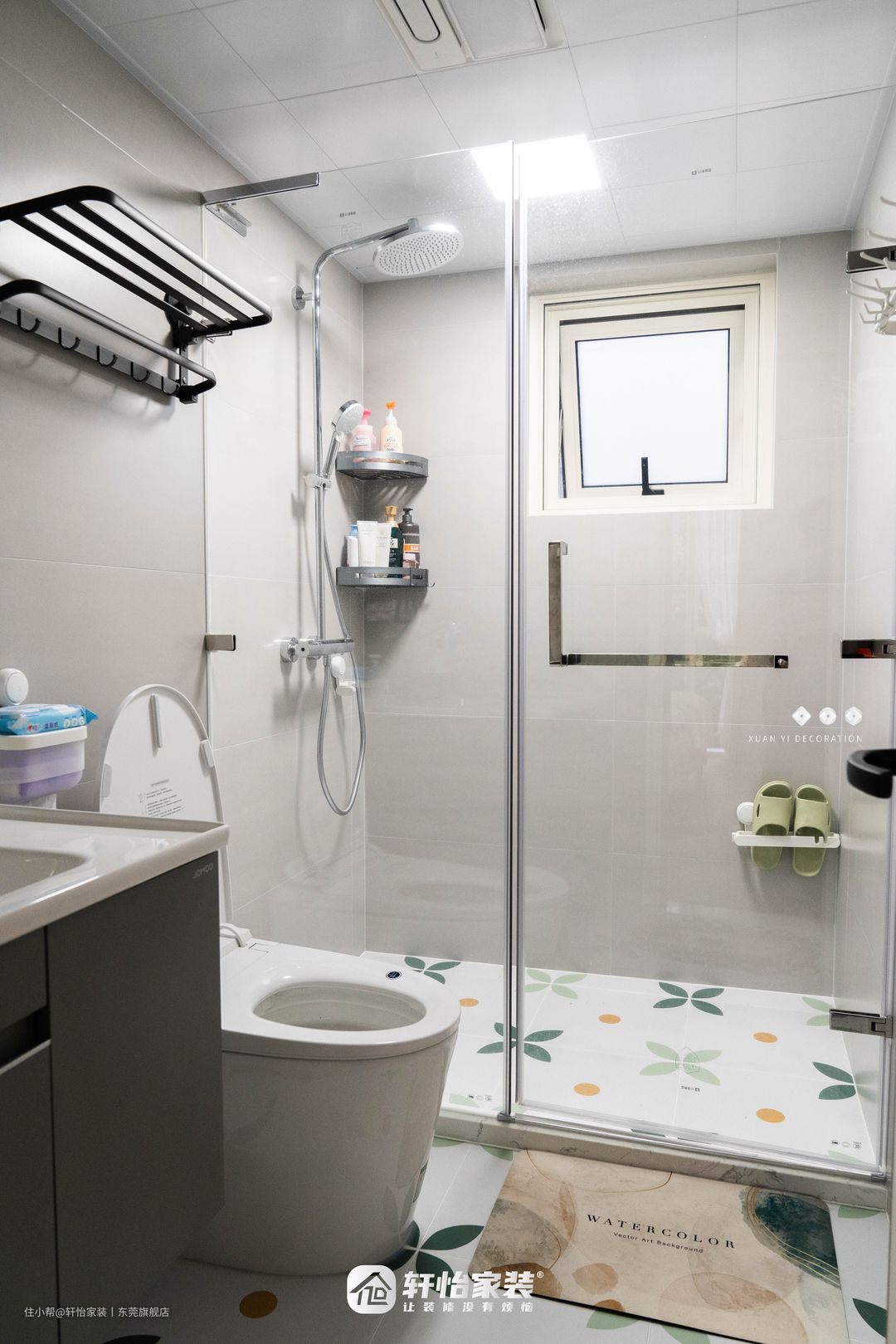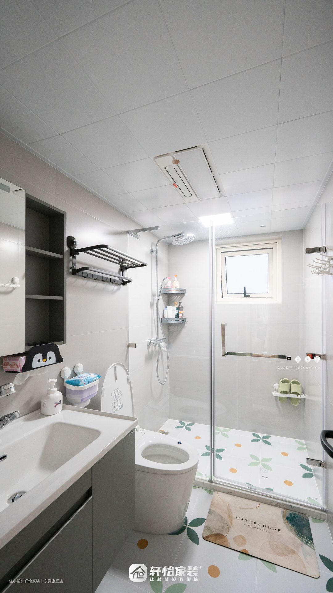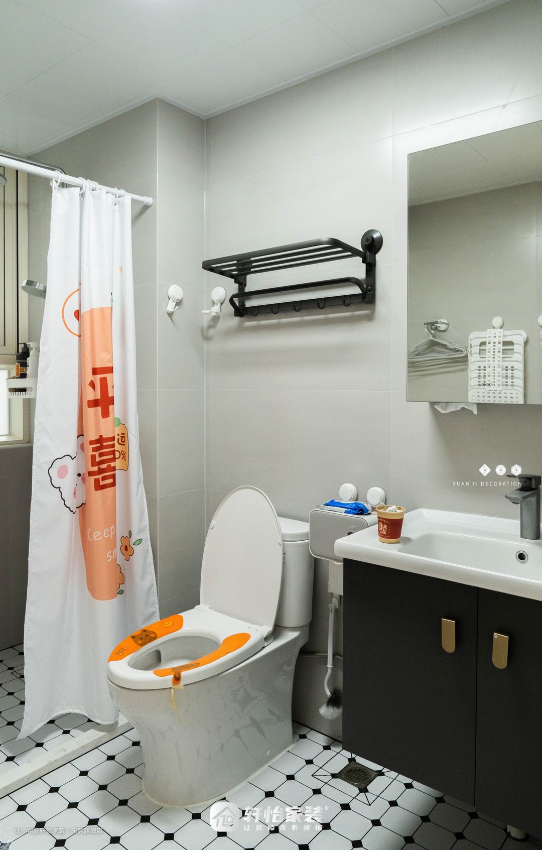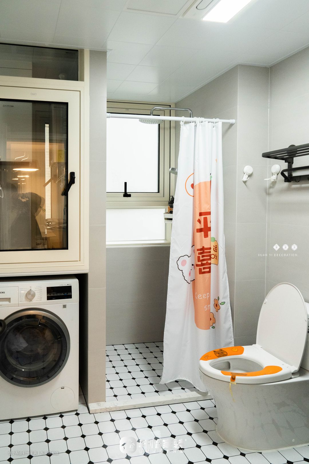 厨房、卫生间、生活阳台的三方重组,诞生出多重功能区将洗衣、洗浴融合。浴帘代替玻璃门,化解空间不足的尴尬。 花砖赋予地面艺术气,渲染出独特空间氛围,并从色系上呼应浴室柜,黄铜拉手做点缀,复古气十足。