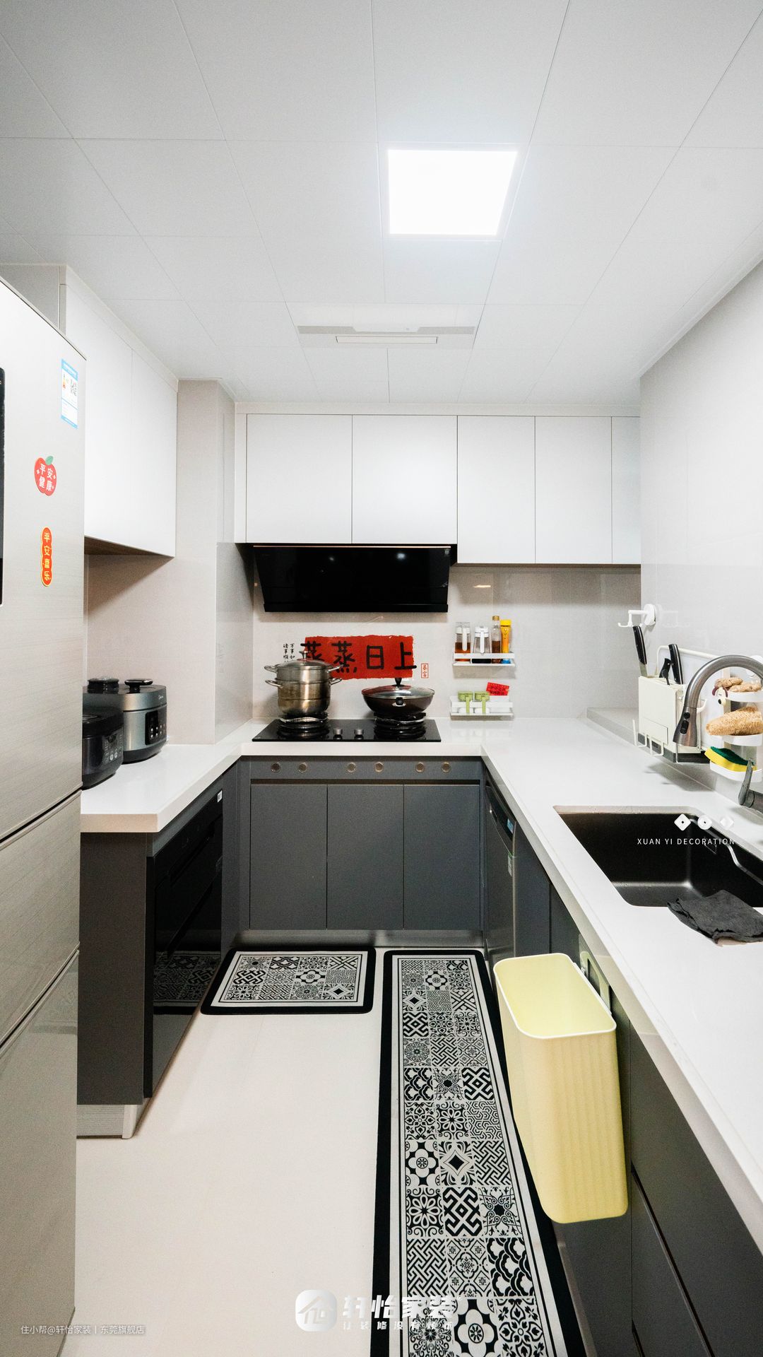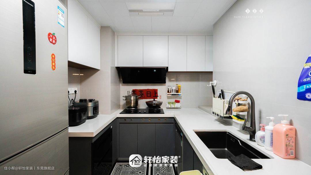 橱柜+冰箱组合出黄金布局,在小空间内将烹饪场景妥帖安排。橱柜上白下灰的深浅相宜,将空间过渡出层次。 墙面克制增设些许小层架,将调料收纳安排至立面,更显台面清爽简洁,也是现代设计的细节风格诠释。