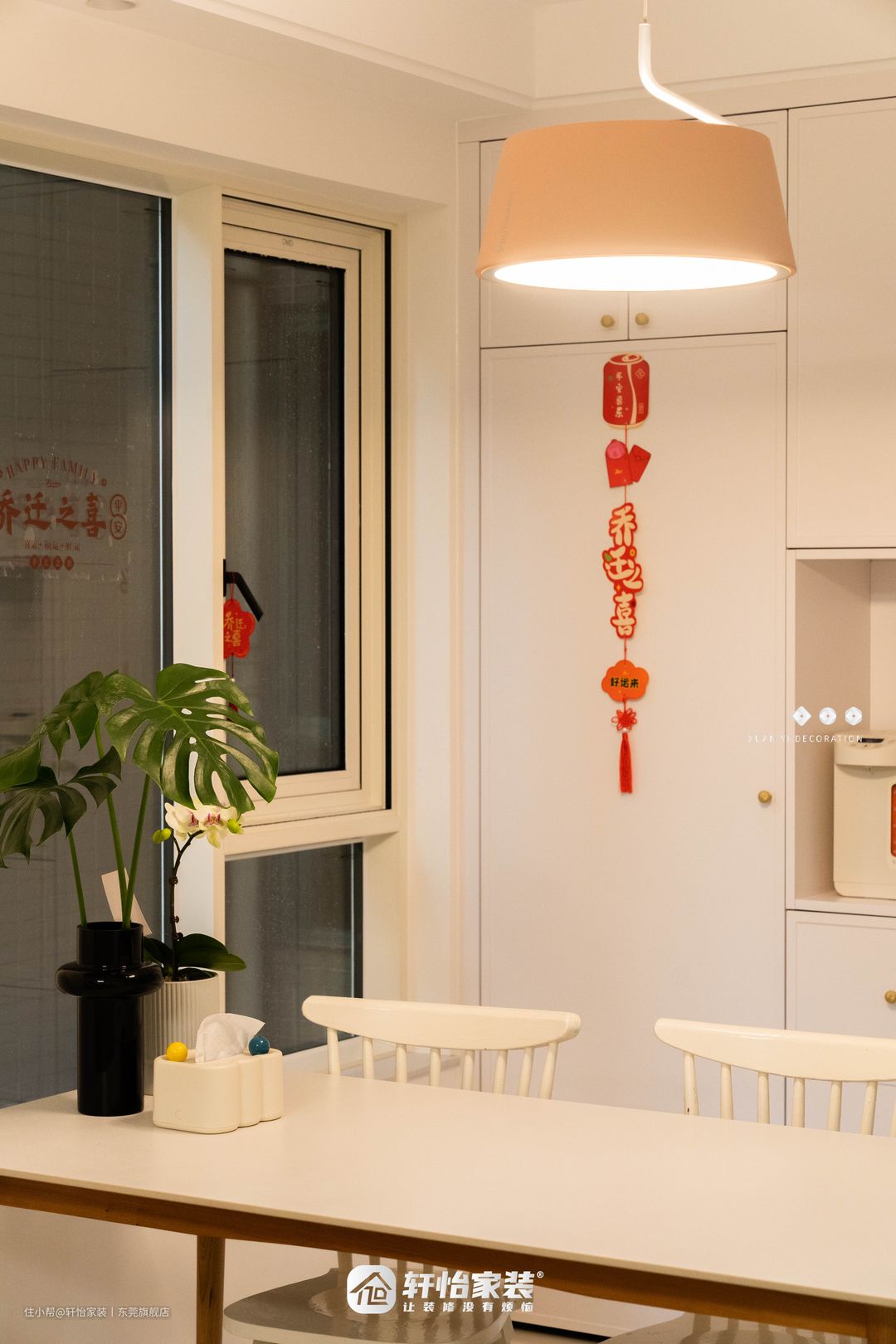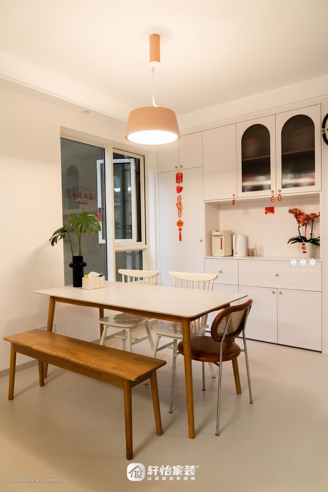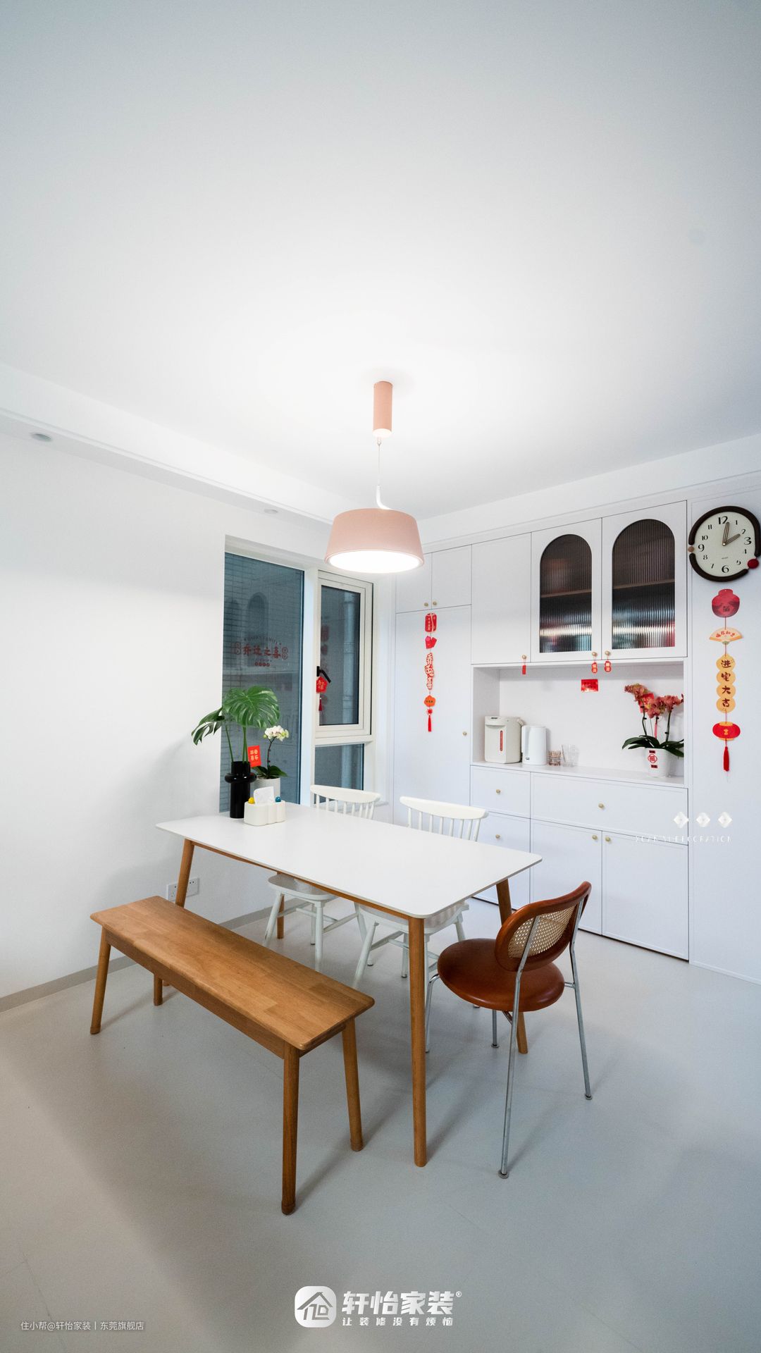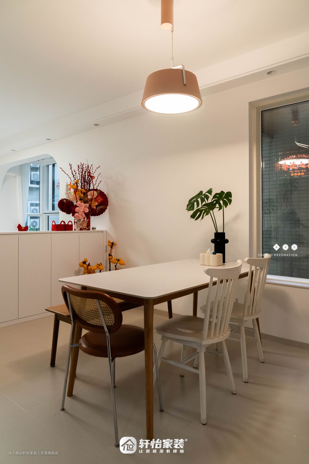 空间铺陈打造出视觉上的木质调,厚重温暖。大比例白将风格元素轻量化,伴随着植物,激发出对三餐四季的美好回忆。 三种餐椅拼配,大玩式样混搭。木质厚钝被金属、藤编异化,成为轻盈表达。光成为餐区氛围的创造者,丰富生活与空间的关联细节。