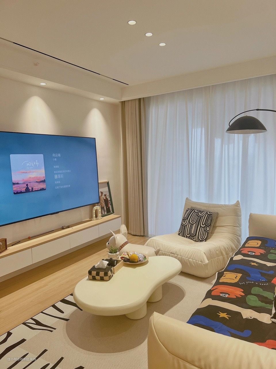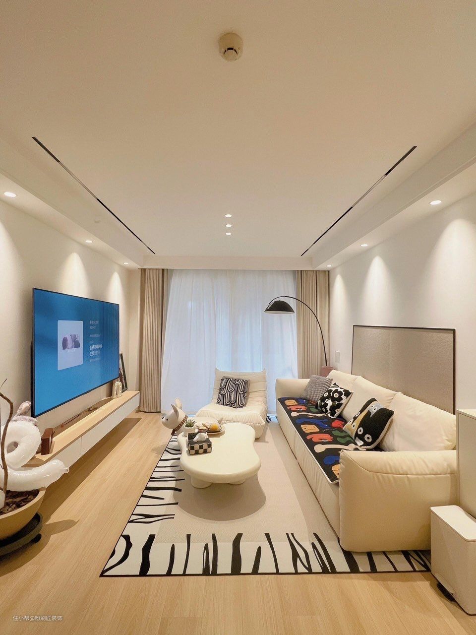以奶油色为基础,搭配一些深色的家具和装饰品,营造出一种高贵、典雅的氛围。让你的家成为一个让人羡慕的艺术品。 现代奶油风,是一种充满艺术感的装饰风格。它以柔和的色彩和精致的细节,打造出一个高雅、时尚的家居空间。 进屋入眼就是全屋的木地板 原木色系显得空间温馨舒适 无主灯设计以筒灯做主灯 磁吸轨道灯作为辅助光源 简约大方 电视柜由原木与出色的结合 永远都是温柔的存在 悬浮式设计方便打理卫生 减少卫生死角 米白色的沙发与花纹地毯结合 搭配落地造型灯 浪漫且惬意