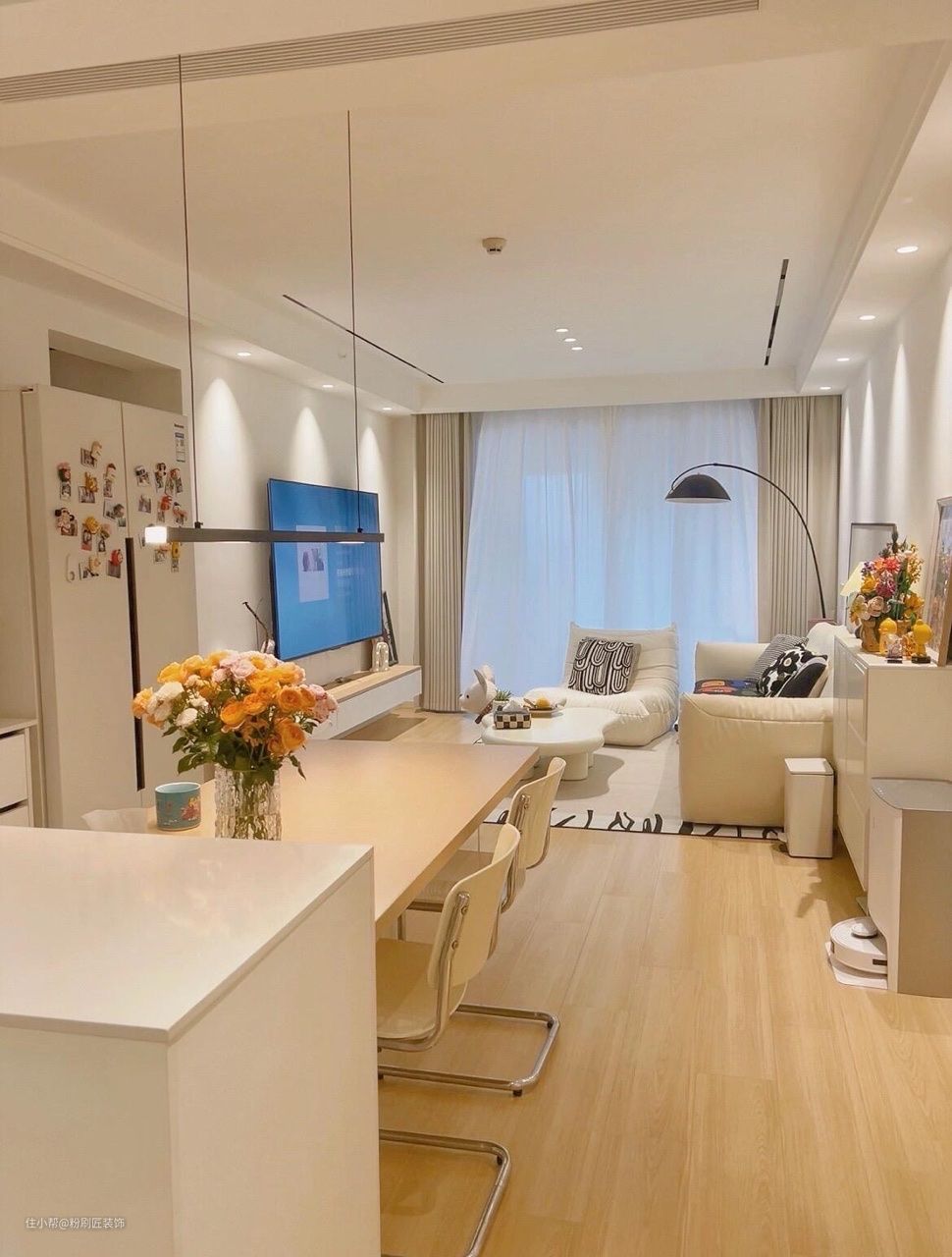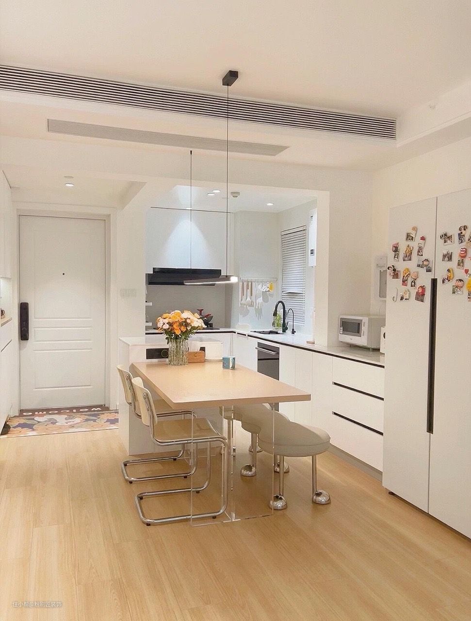 餐厨一体化设计 使空间看起来更加敞亮 轻盈 橱柜延伸做餐边柜 收纳不常用的杂物 侧边摆放双开门大冰箱 容量大 白色的外形与整体风格也十分搭配 白色岩板岛台延伸木质餐桌 亚克力材质的桌椅 没有了普通桌椅的厚重感 显得更加轻盈简约时尚