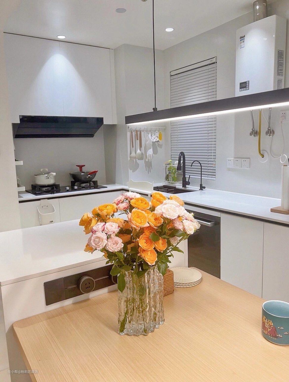 开放式厨房设计让整个空间看起来更加明亮舒适 L型操作台面满足日常的需求 洗槽下方嵌入洗碗机即可以清洗碗筷还可以消毒杀菌 存储 简单空间的占用 充分利用墙面 做一些悬挂式的挂件 摆放厨具 下柜延伸到餐厅 整体设计看起来更加整洁舒适