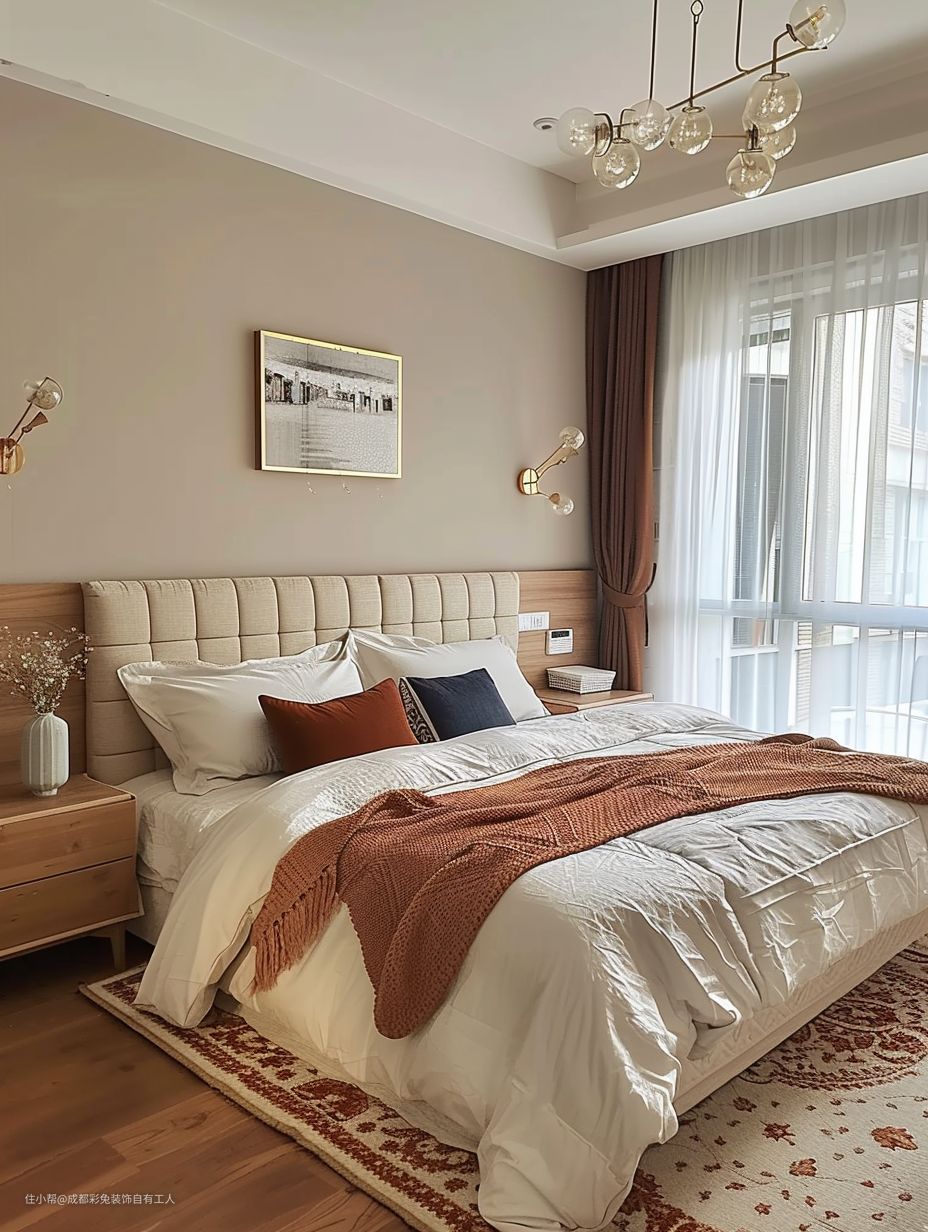 床上可以搭配一些柔软的毛毯或床罩。 床头柜上放置一盏温馨的小夜灯。 摆放一些香薰,营造舒适的氛围。