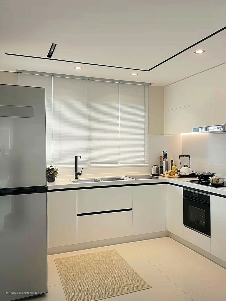 窗户保证了采光和通风。嵌入式电器整洁美观,双槽洗碗槽方便实用。冰箱的合理摆放提高了厨房的使用效率。整体 L 型布局合理利用空间,白色橱柜干净整洁。防滑地毯确保安全。
