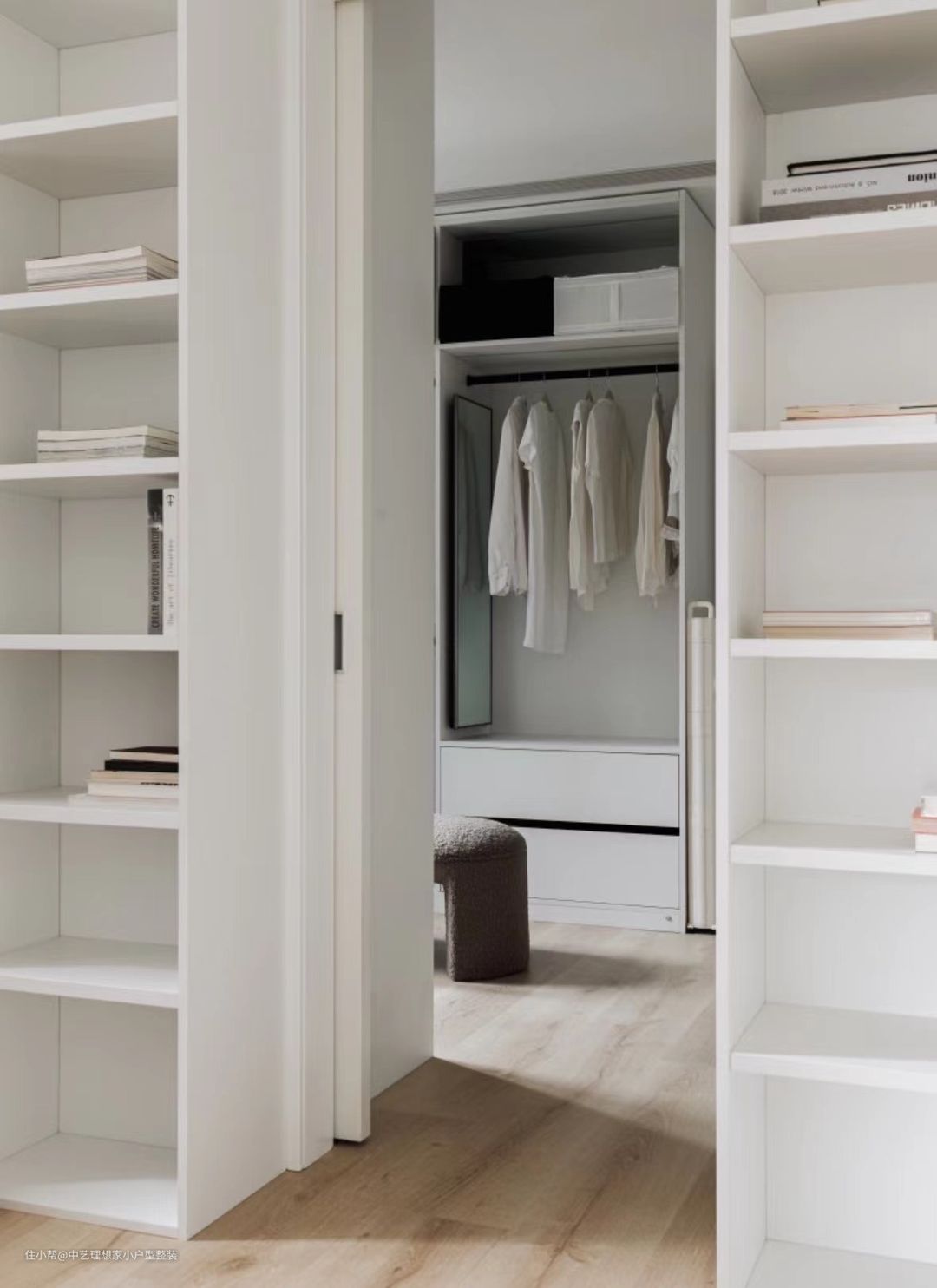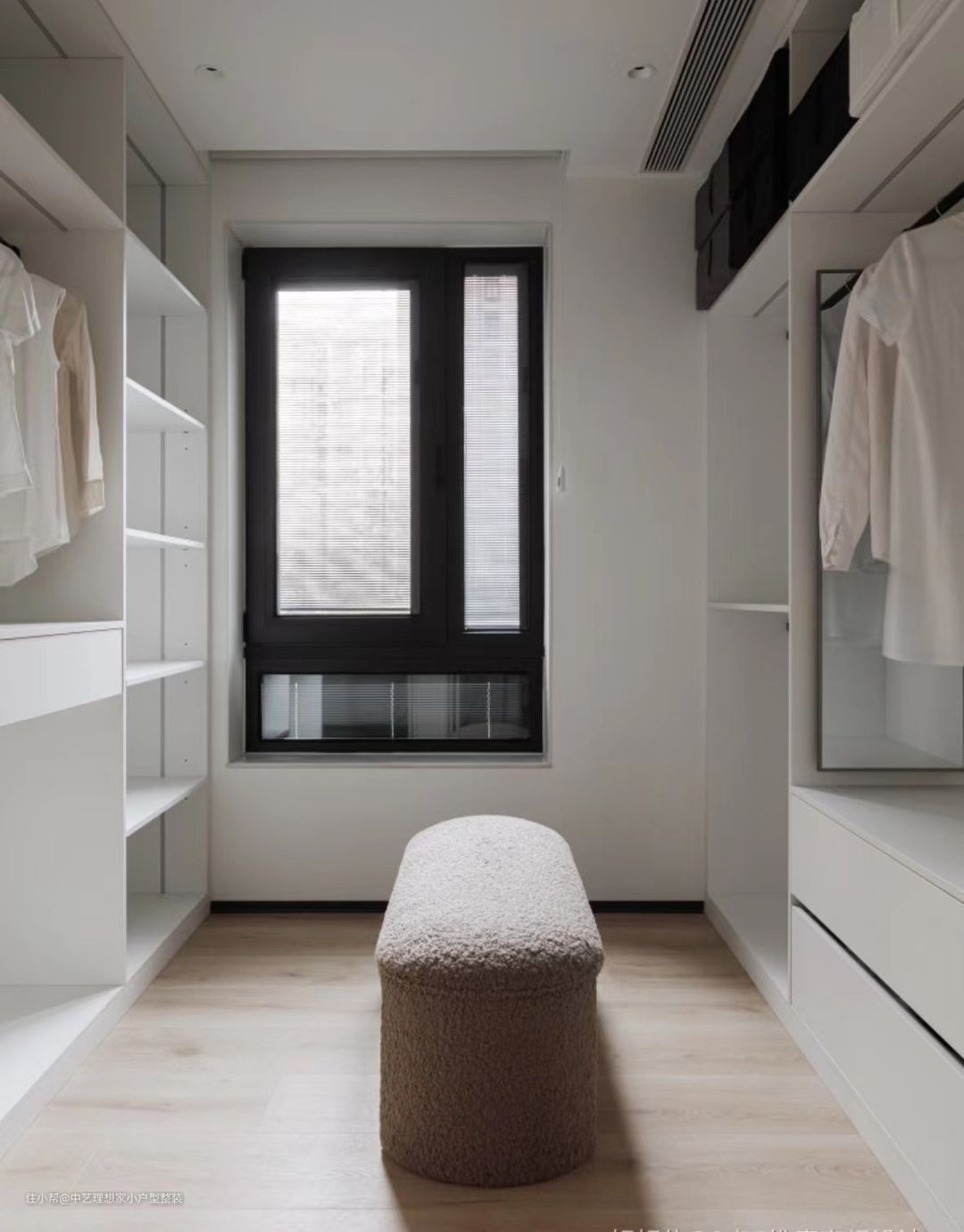 衣帽间内,平行的衣柜布局可分区收纳男女业主的四季衣物,中间设置坐凳,方便换衣时使用。