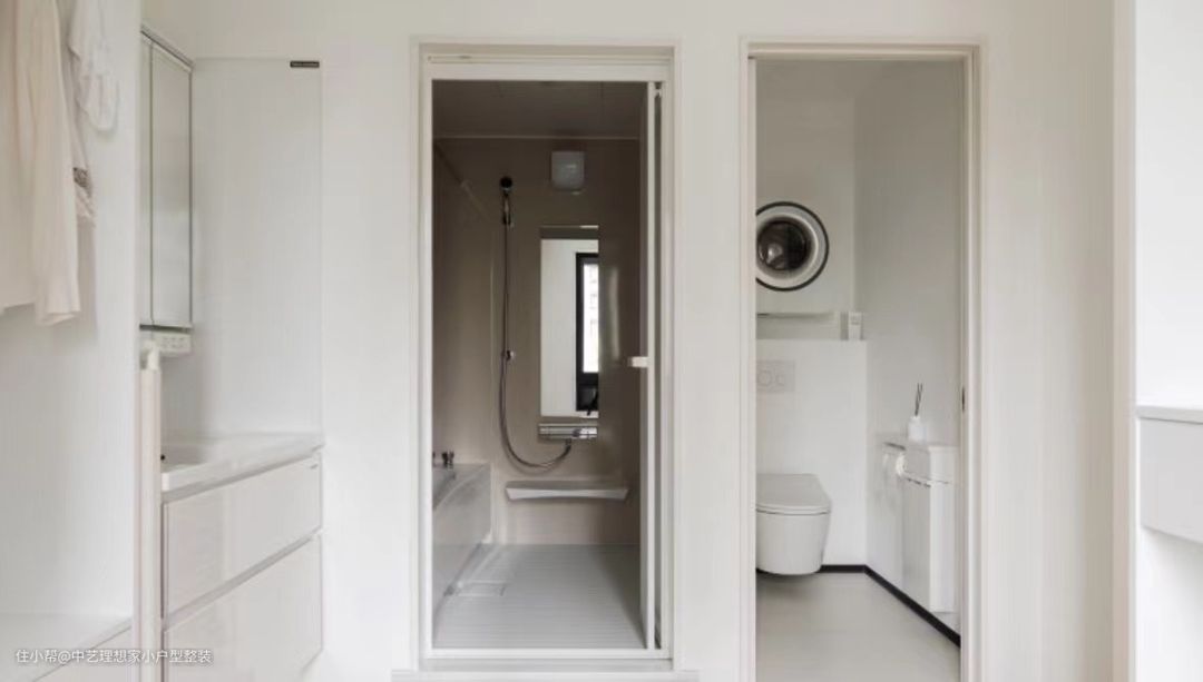 主卫的干湿三区分离布局,最大化隔绝水汽,也能带来使用的便利与功能的合理。利用马桶间的上下水新增壁挂洗衣机,业主日常可用来清洗贴身的小件衣物。主卫淋浴区域的设计是整体浴房设计没有再墙面贴瓷砖。