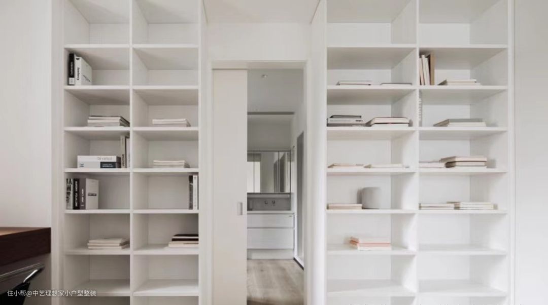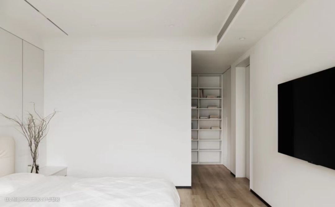 主卧整体采用三段式的功能分区,纳入书房、办公区、衣帽间、卫浴间等功能,改为功能丰富的套间形式。卧室入口靠近空间中段,所以将对隐私要求没有那么高的书房设置在了这个区域,左侧连接卧室,右侧串联衣帽间,业主睡前可以在书房简单处理工作或阅读,然后去衣帽间洗漱后回到卧室,整个动线分布流畅,不必走出卧室就能解决业主90%的睡前活动。