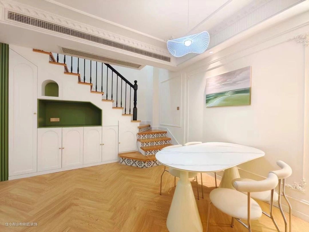 法式线条和角花相互成就打造美丽的背景墙 吊顶除了钢琴键的设计除外增加了虎头石膏线搭配 双层的设计凸显空间的层次感 让整个空间看起来更加高级 楼梯下方 利用不规则的空间做餐边收纳柜 白色与绿色板材的搭配自然清新 中间镂空的设计用于摆放小家电 即使是不规则的造型 依然是整个空间内独特的存在