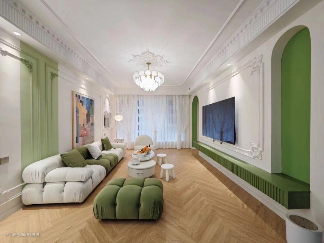 法式+奶油风,值得一场浪漫 法式的浪漫是生活最好的文案,惬意温柔、远离喧嚣、归于舒适。 绿色与白色的主题色调交织出一幅清爽干净、浪漫高雅的画卷。绿色和白色相映成趣,为空间注入了一种自然与纯粹的韵味。 空间通铺木地板 人字形的手法让整个控价更加有层次感 以白色为主色调通刷墙面从中穿插绿色的元素来整体搭配 法式的元素非常巧妙地点缀整个客厅,从精致的雕花到复古的线条无疑不是在提升整个空间的氛围感 法式灯盘搭配水晶吊灯真的美不胜收 高级感瞬间拉满。