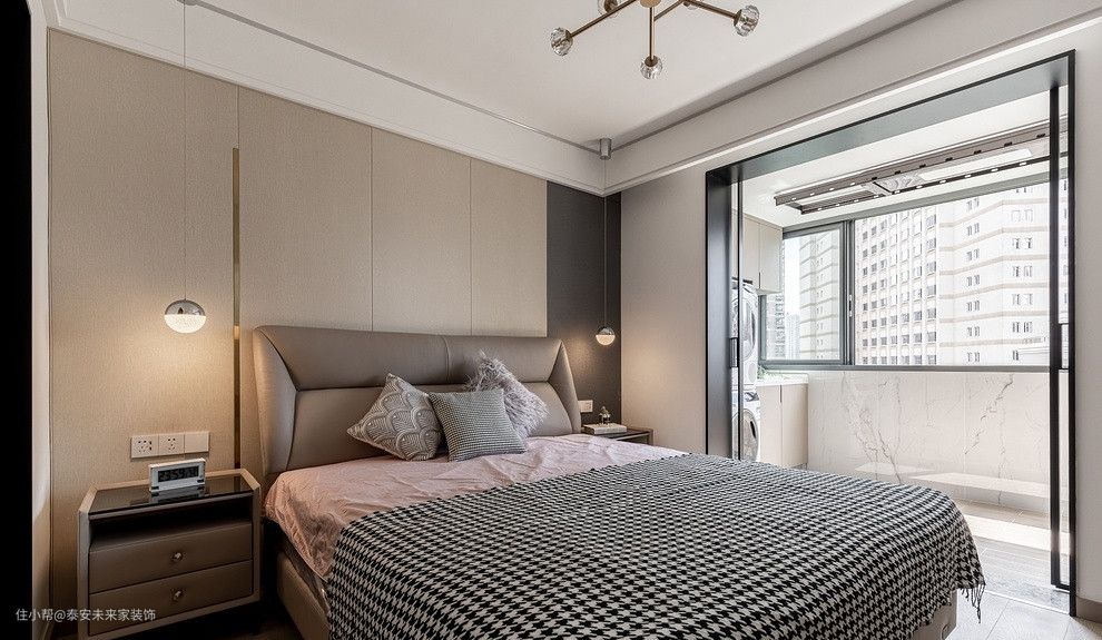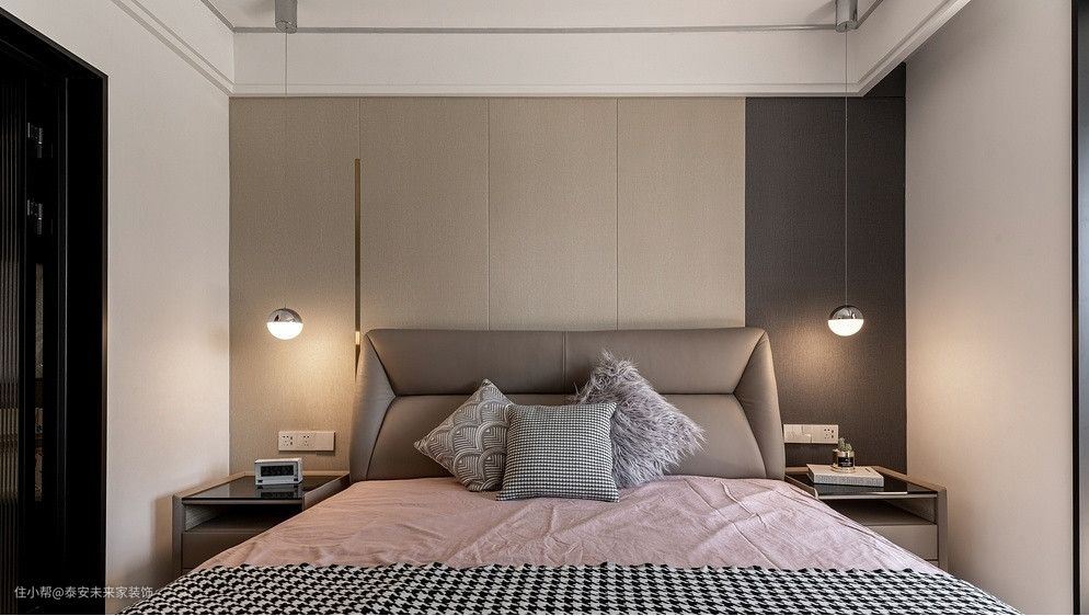 床头背景同样采用了不对称设计,呼应客厅造型,莫兰迪色系的空间呈现出舒适的温馨感。柔软的床头靠背搭配静谧的灯光,营造出素雅柔和的睡眠空间。卧室吊灯同样采用枝形灯,空间与空间之间联动总是格外诙谐。 圆形的床头吊灯高度适中,应和了业主夫妇睡前阅读和游戏的光线需求。造型简约的床头柜呈对称分布,玻璃材质和舒软的皮质,将空间质感完美呈现。床上抱枕呼应了沙发抱枕的造型,与粉色床品一起营造出静谧温馨的空间。