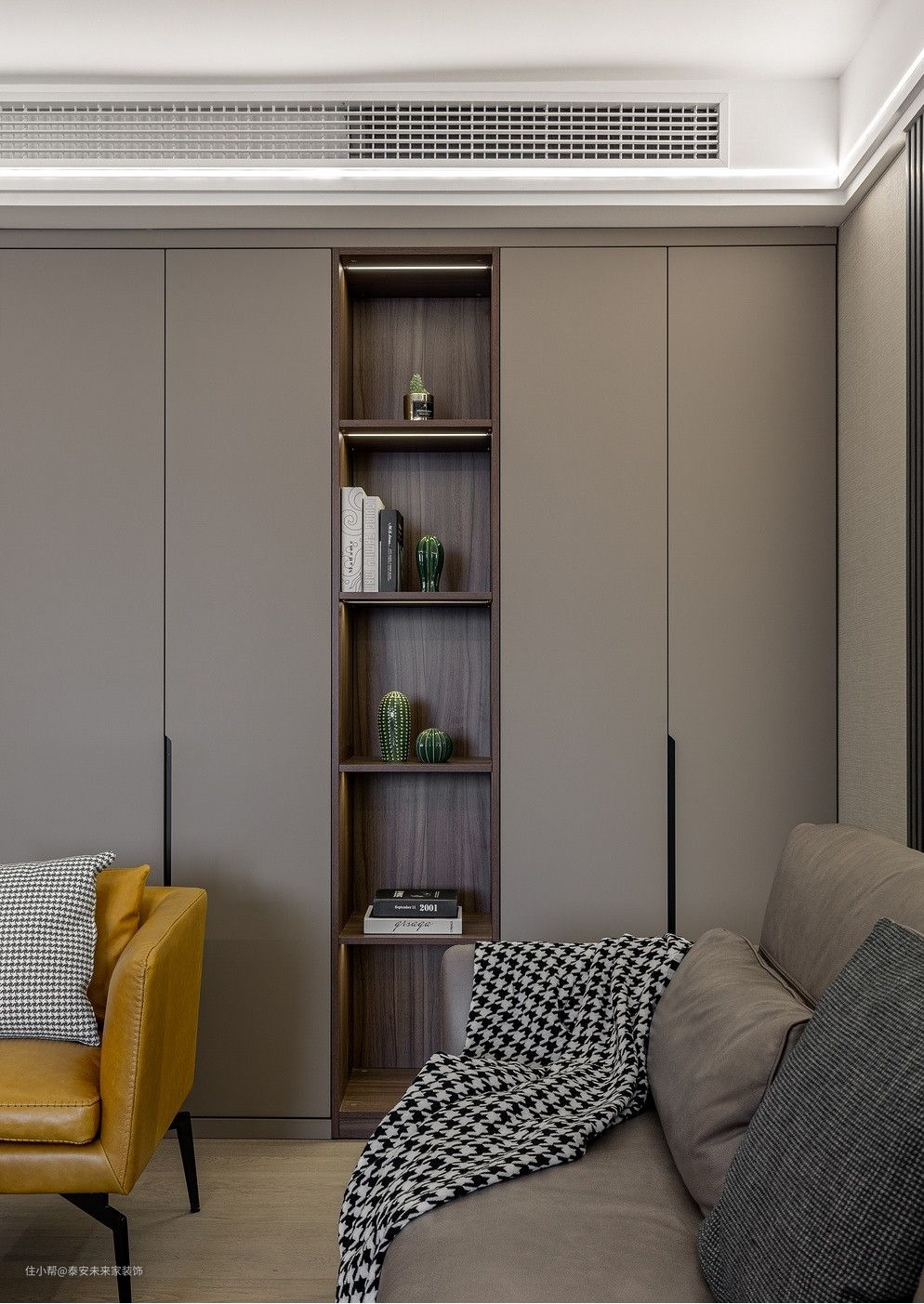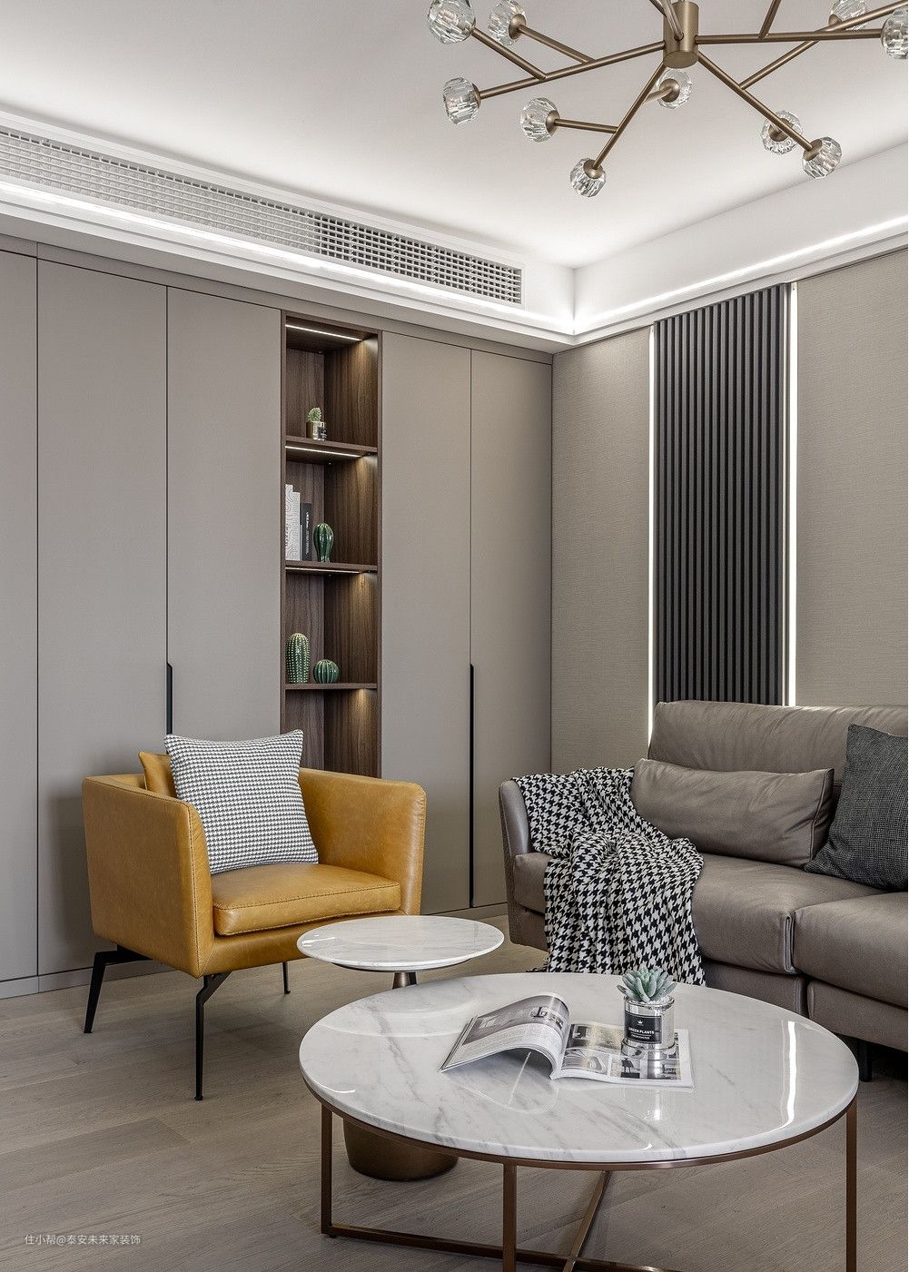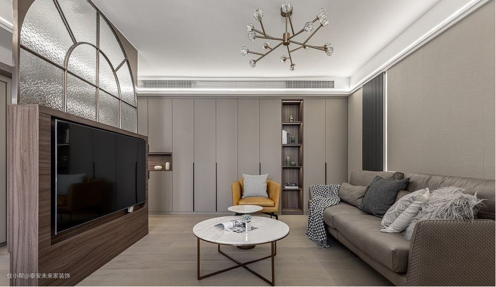 整个客厅通过高级灰色调,营造个性摩登的空间。最引人注目的是屏风隔断的设计,木质柜体和玻璃隔断的组合,既避免了空间一览无余的尴尬,又为电视机腾出了安放的空间,一举两得。 灰色亮皮沙发、灰色整体橱柜和原木地板的组合,呈现素雅干净的视觉感受。三人座的沙发十分舒适,深灰浅灰抱枕的加入营造了丰富的空间层次。亮黄色单椅的加入,打破了整体沉闷的空间色调,搭配轻薄茶几打造大气舒适的休闲空间。 金属材质的枝形吊顶与茶几架相呼应,展现了居住者对生活品质的追求。无吊顶的设计,搭配线性灯带环绕,让空间更显宽敞亮堂。沙发背景墙采用了栅栏装饰板+灯带,简约前卫、个性十足。 通顶墙柜的设计,让家里不常用的杂物都能通通隐藏起来,灰色的柜体与整体空间色调协调一致,不失美感。空出一栏橱柜做开放式处理,添加隔板放置绿植,给空间增加些许活力生机。