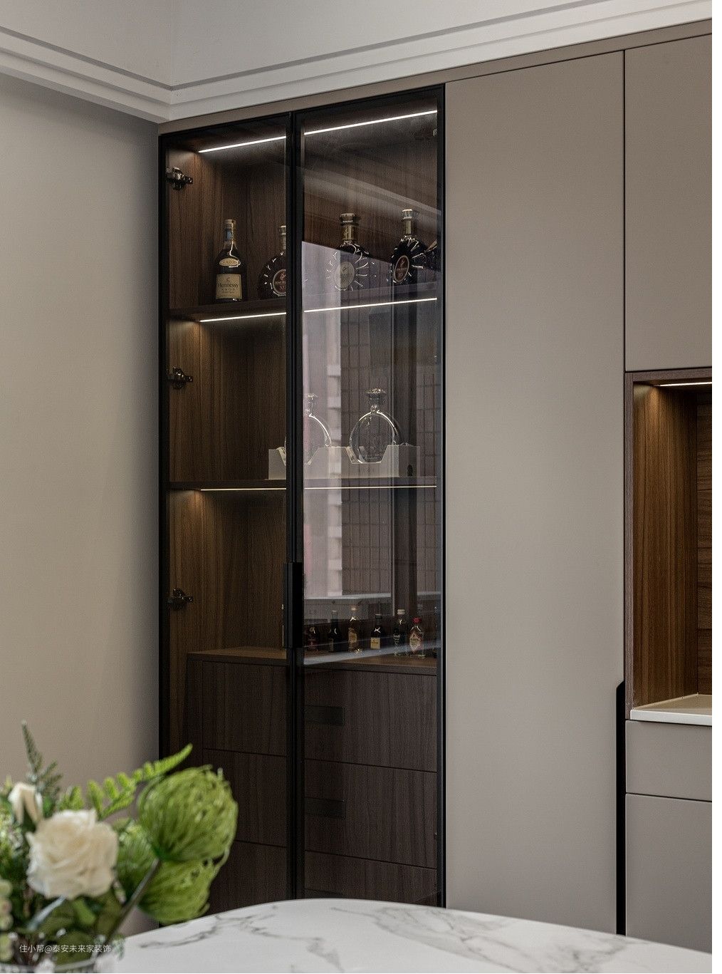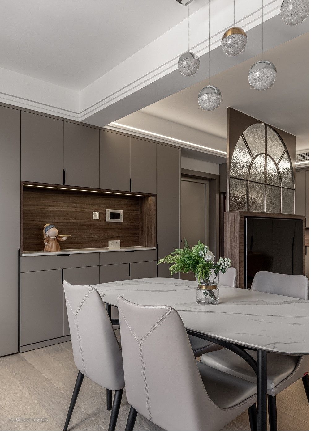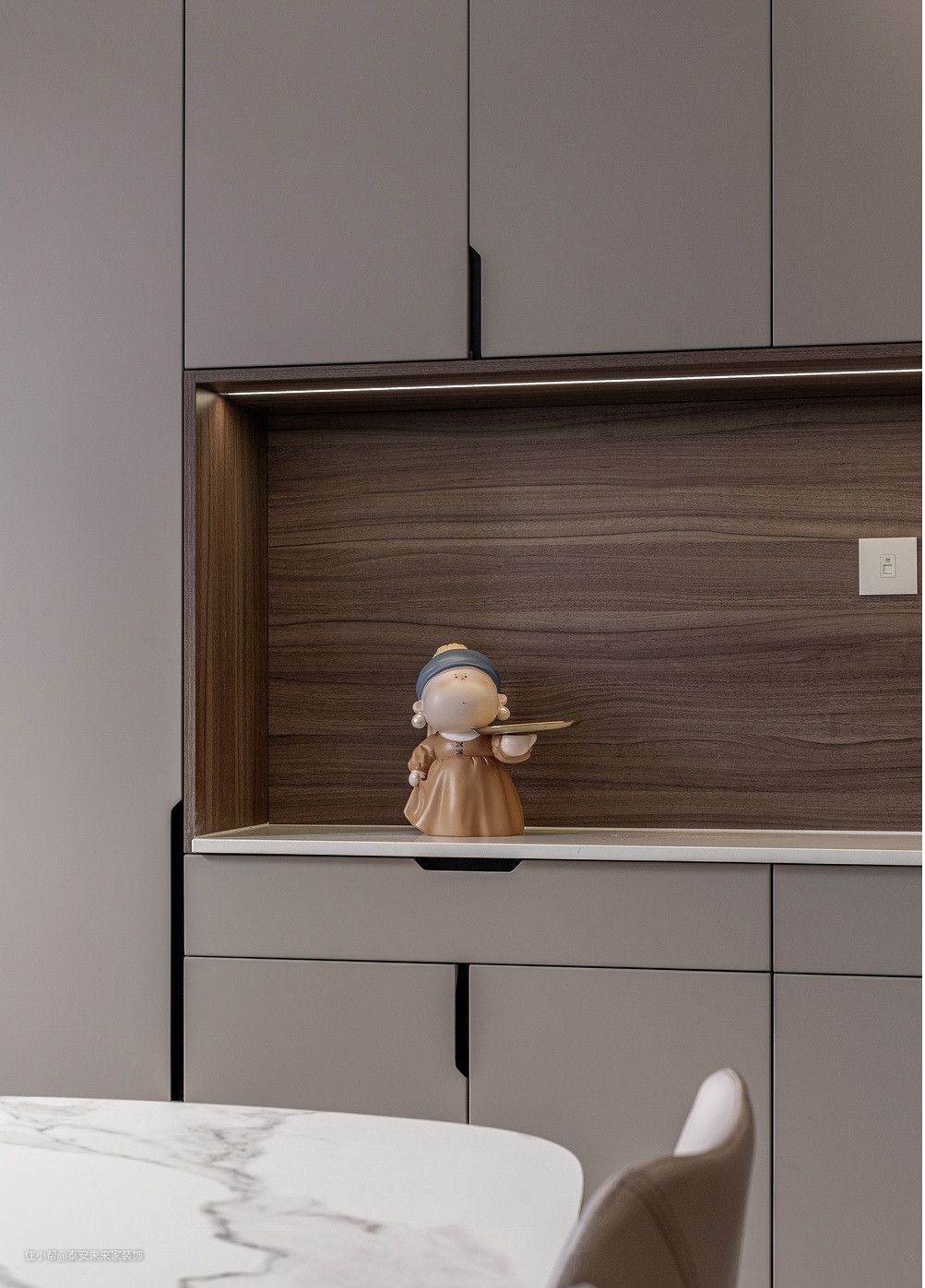 餐厅同样是素雅的灰色调,灰色皮质餐椅简约大气,小细跟的设计保证了餐椅的轻巧,随时可以收纳近餐桌下面。圆润的岩板桌面搭配黑色桌架,干净利落又舒适大气。星球般的吊灯垂照下来,为餐厅增加了几分静谧的美感。 餐边柜设计也应和了客厅橱柜风格,但在造型上有开创出自己的新意。中间掏空添加柜底灯带,放置小摆件、常用餐具,美观又实用。同时还预留了插座位置,方便小型厨电的使用。 靠墙角位置的柜门采用玻璃材质,搭配线性灯带,打造男主人专属的储酒柜。闲时约上二三好友一起品茗,闲话家常,也不失为一件乐事。餐桌摆放清新的绿植和花卉,清新雅致的氛围感就此蔓延开来。
