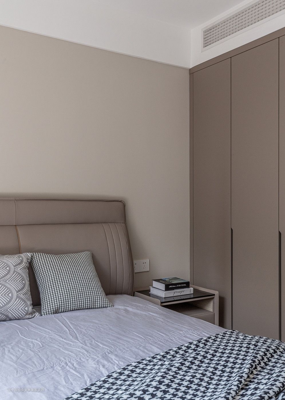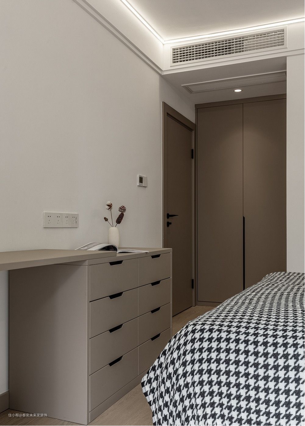次卧是女儿的专属房间,奶茶色的空间舒适温馨,圆形吸顶灯作为次卧主要光源,简约大方又能表现空间通透感。床头摆放书桌,让小女儿能够有舒适的学习空间,线条感满满的桌椅造型,呼应了整个家简约舒适的主题。 次卧一柜到顶的衣柜,满足了小女儿衣物和玩具收纳需求。橱柜上方预留了中央空调出风口,美观实用,保证睡眠空间的舒适度。