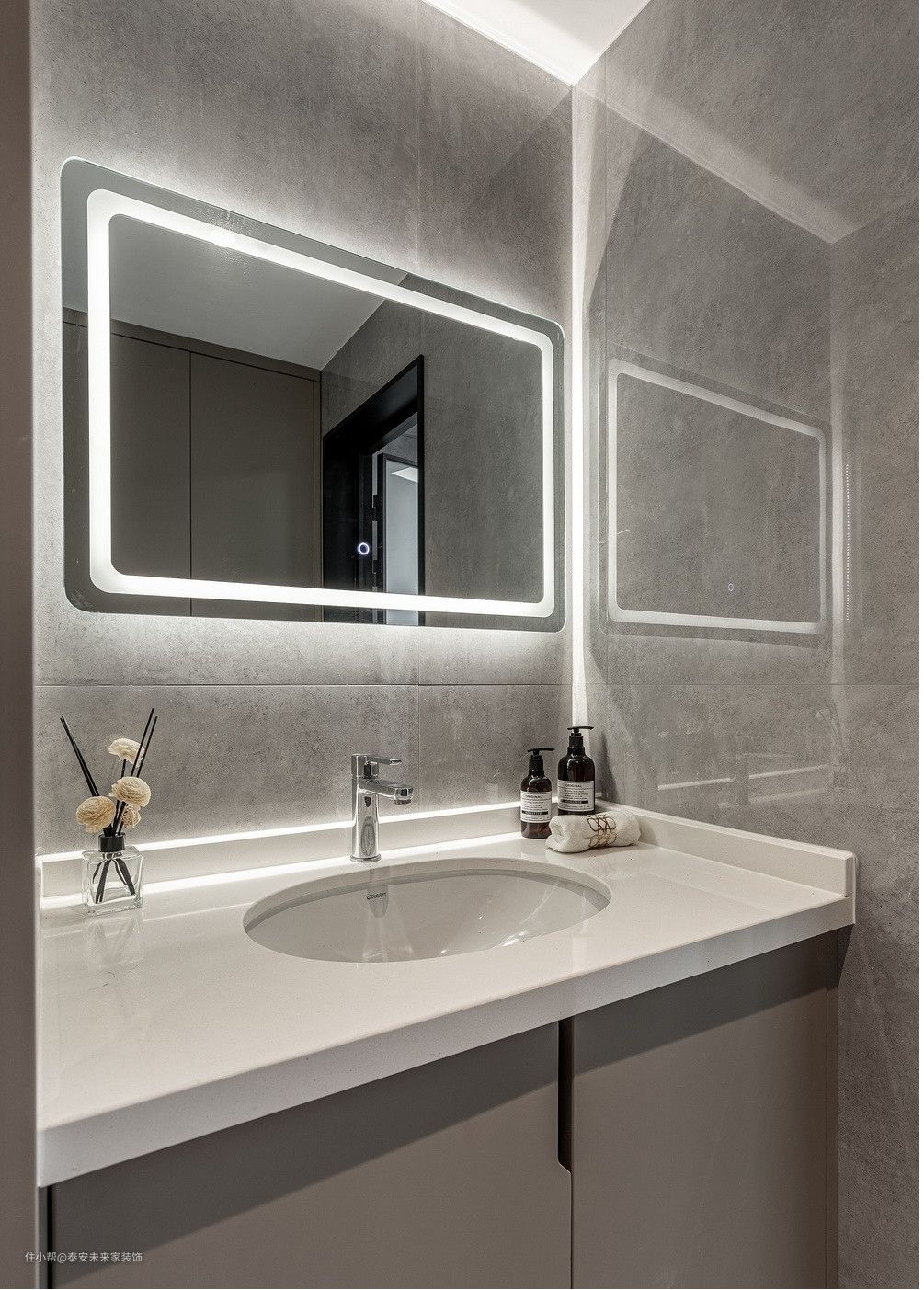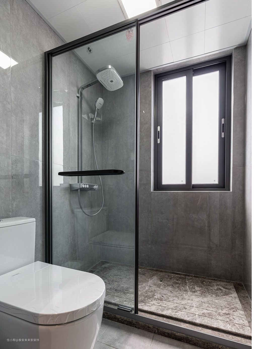 三分离式的卫生间保证空间的清洁卫生,将洗手台外移,也提升了其利用率。 宽面镜搭配线性灯带,弥补了空间采光不足的问题,让这里也可以兼备梳妆台使用。大体量的浴室柜满足了卫生间储物和收纳。 坐便区和淋浴区选用玻璃推拉门设计,灰色瓷砖营造宽敞大气的视觉体验。宽敞的淋浴房保留了两个淋浴头,大排量的淋浴头保证了洗浴时的舒适。