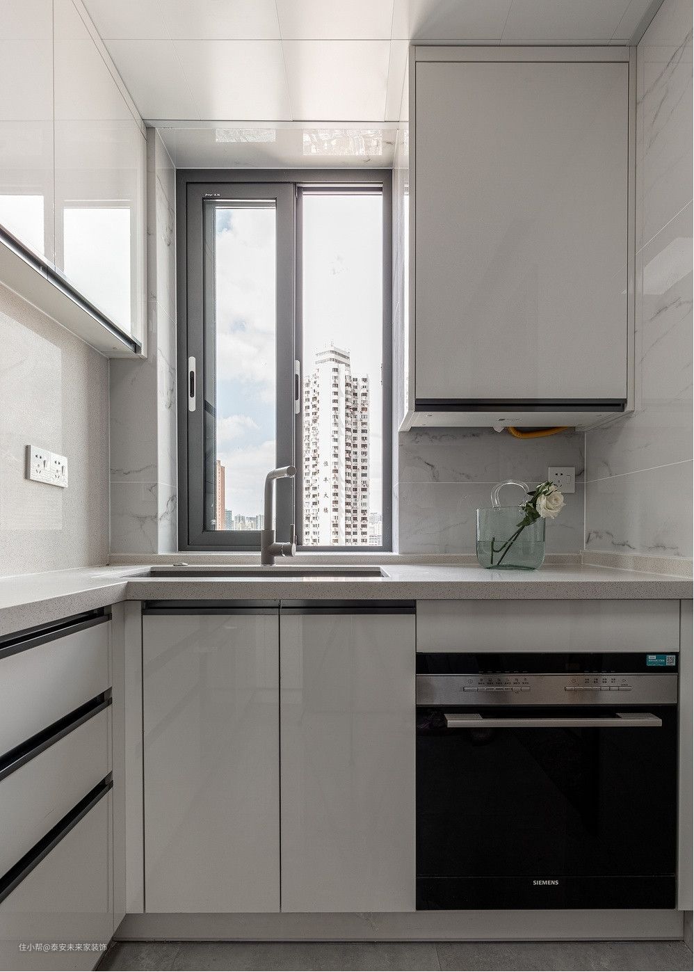 厨房的空间较小,狭长性的空间,更适合L型布局。从洗菜、备菜到烹饪,满足更加便利合理的空间动线。洗手台设计在窗前,让业主在厨房忙碌时也可以随时看看风景。 白色的整体橱柜,满足了大量餐具的收纳需求。柜底做留空设计,为业主提供更加舒适自由的脚底空间。白色大理石墙砖和亮面柜体,将原本狭小的空间做了视觉上的延展。