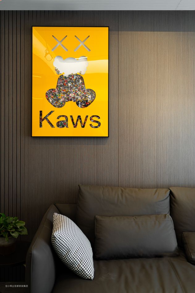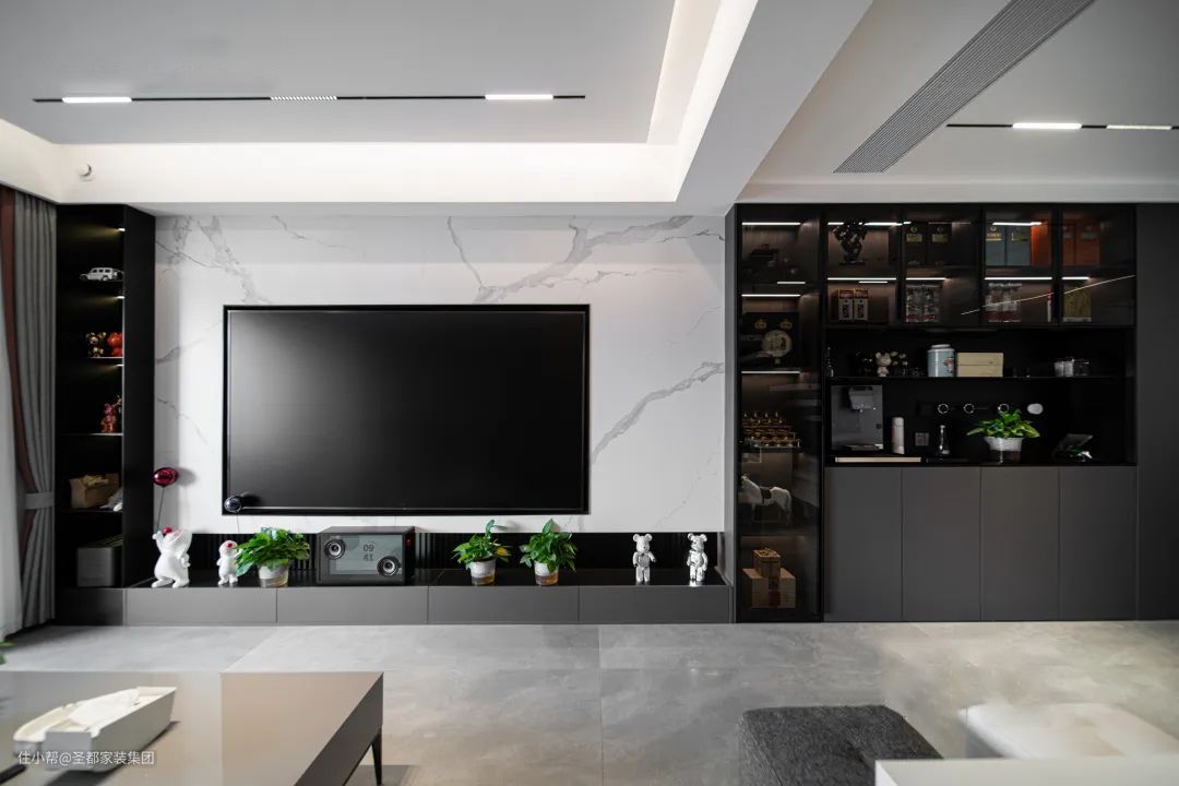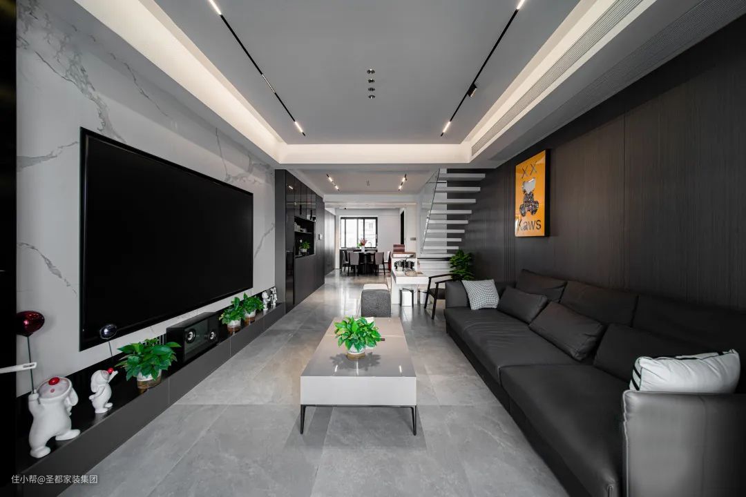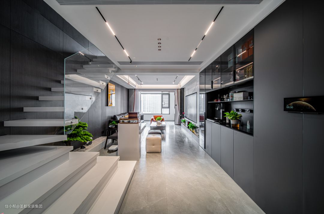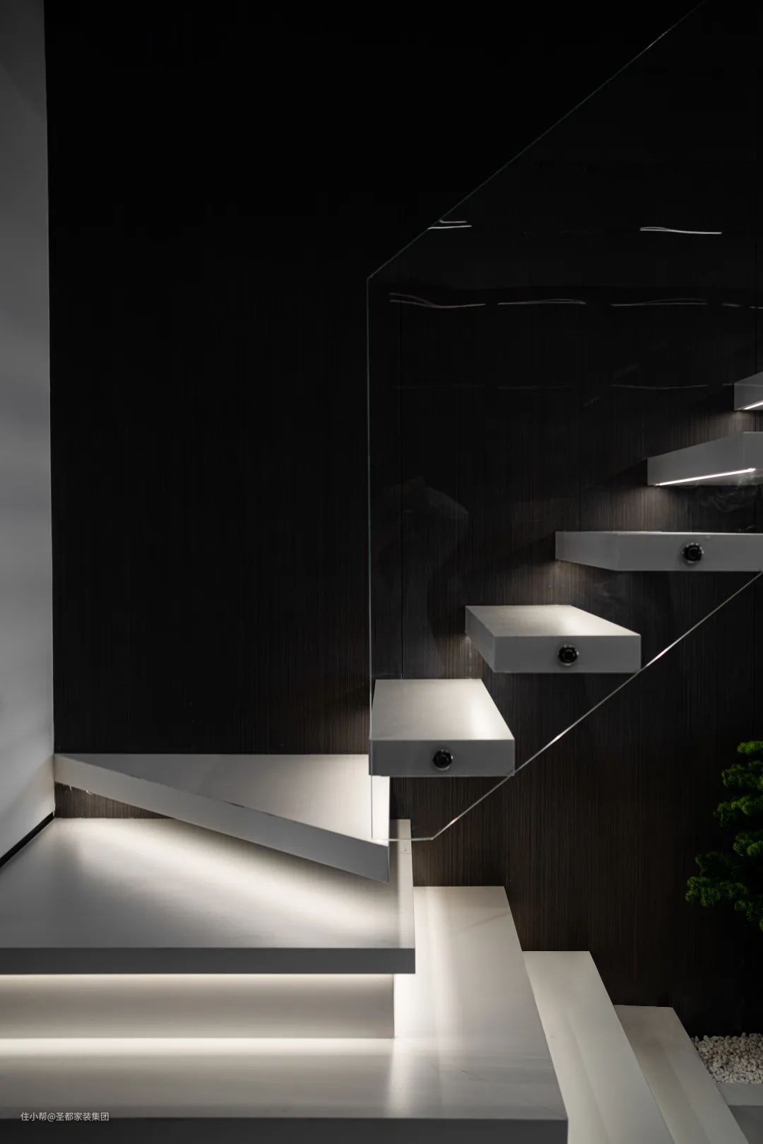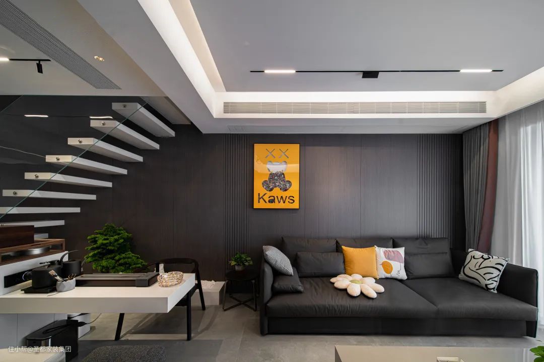 整个客厅以深灰色调为主,深灰色调的地砖加上深灰色木质背景墙和沙发,搭配大理石电视背景墙大气有格调。旁边的茶室空间尤其亮眼,开放式实现更多功能,实用性更高。茶室的设计满足了主人以茶会友、会客,茶台做茶几也能做餐桌,一张桌子实现更多功能,实用性更高! 隐藏式钢制悬浮支撑结构,栏杆搭配简约通透的玻璃,外观简单大气且低调不失奢华,墙上艺术方块的点缀,营造出简约与时尚俱佳的空间视觉美感。