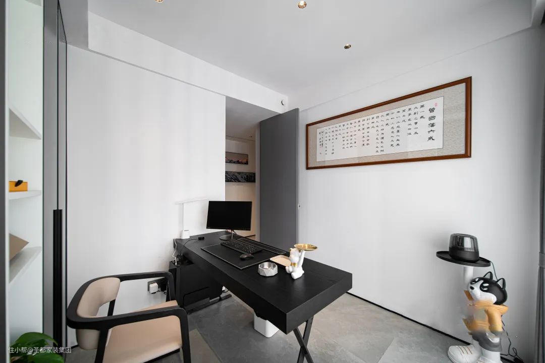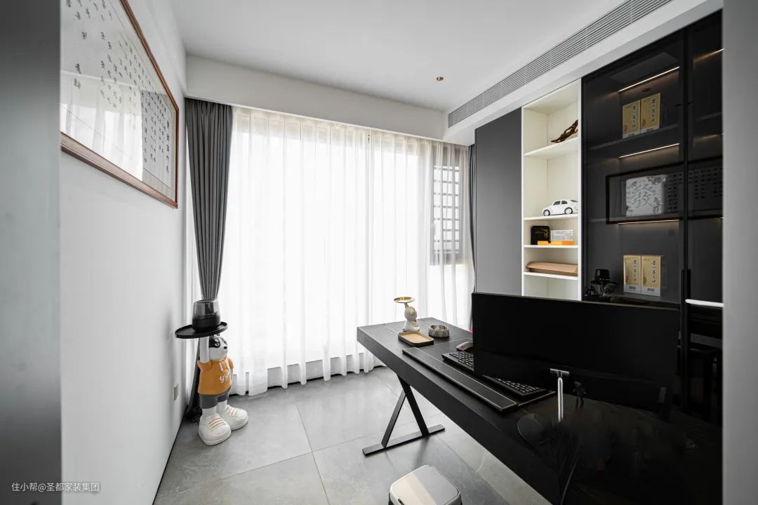 书房的设计沿用主色调,低调、高级,一张实木书桌,一整面灰色橱柜摆设主人日常的收藏品以及书籍,日常在这里办公,惬意又自然。