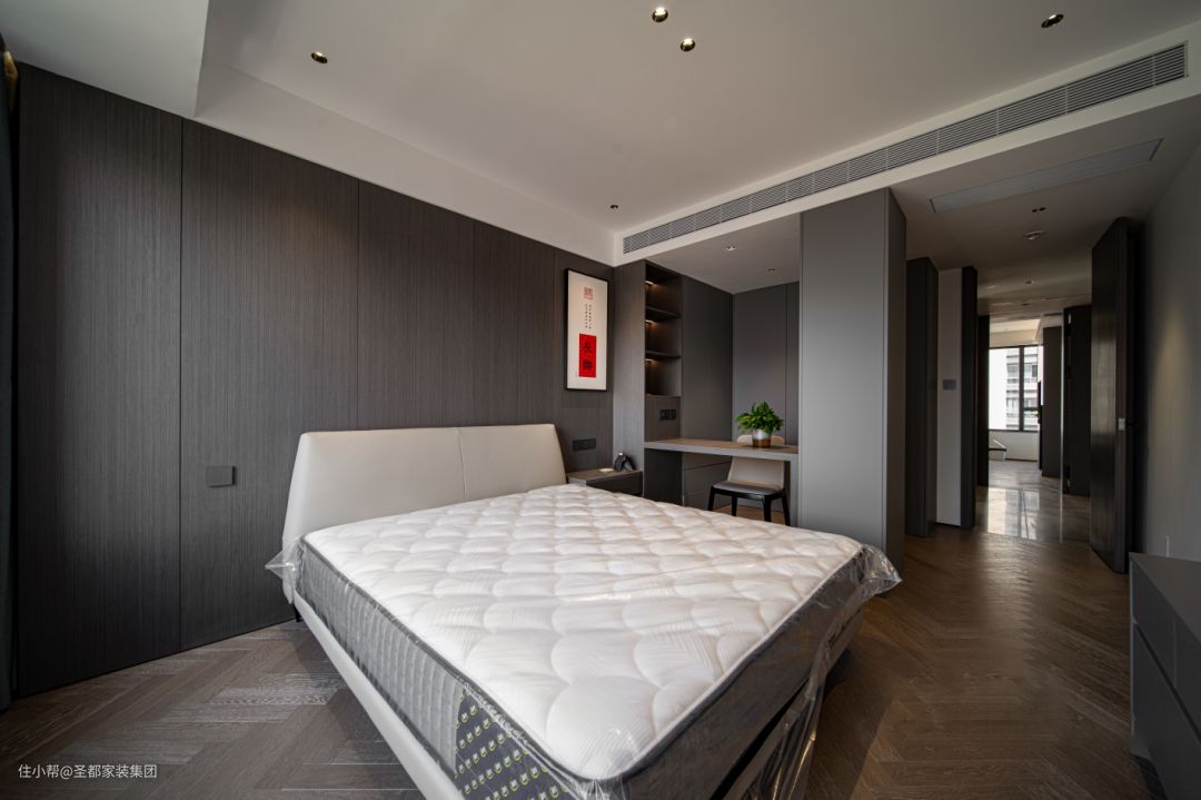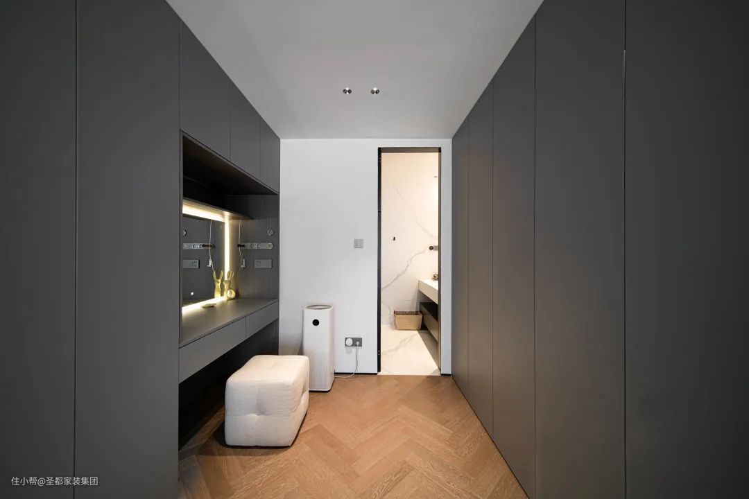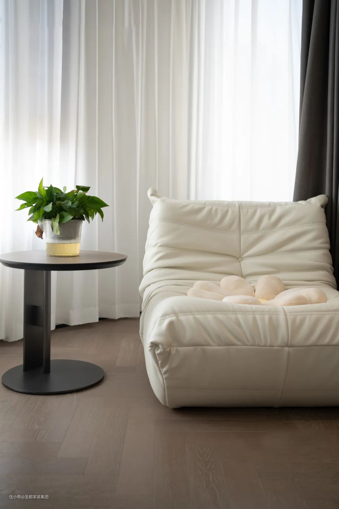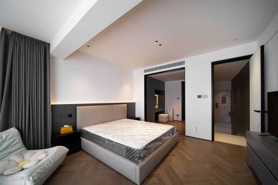 卧室以简洁为主基调,木地板与深灰色的橱柜相呼应,不管是配饰还是纱窗,都显得简洁化一,艺术感十足。独立化妆台和卫生间的主卧同时具备功能性和潮流性,在无主灯设计的映衬下,整个空间简洁又有质感。
