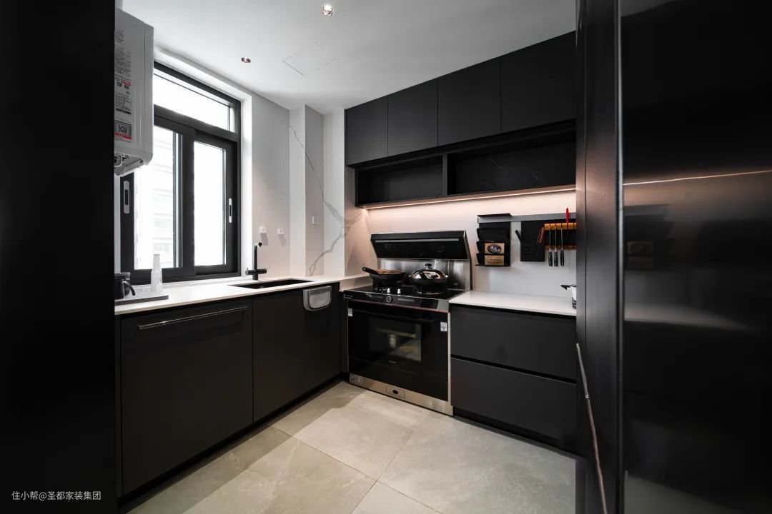 厨房橱柜、电器全是统一的深灰色,赋予空间稳重、高级的感觉,将家电都嵌入柜体打造整洁干净的环境,加上灯带的运用,让烹饪更得心应手。