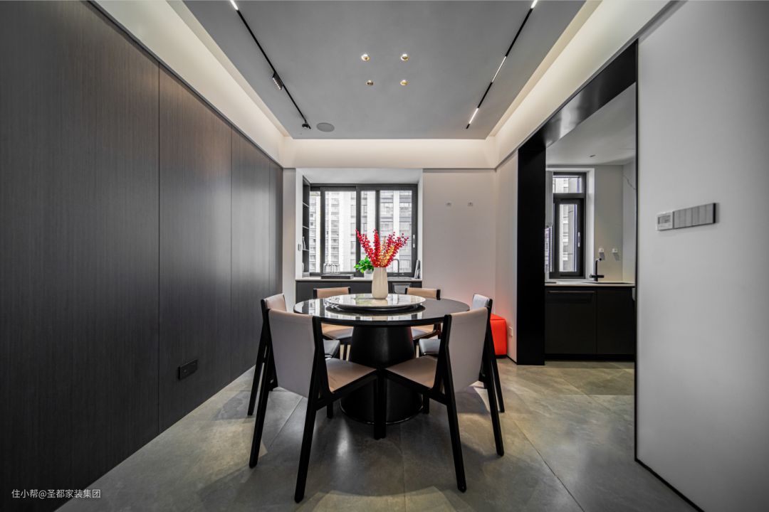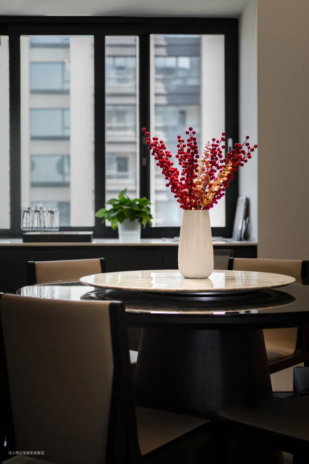 餐厅在厨房的隔壁,开阔的视野和良好的采光,愉悦用餐心情。餐厅没有多余繁琐的设计,一张圆形餐桌搭配几张相匹配的座椅,加上精致花瓶的点缀,舒适又大气。